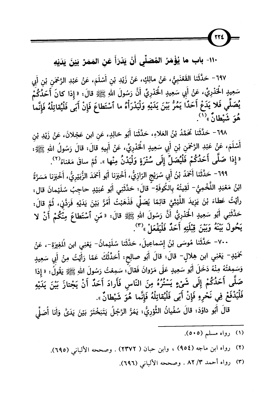 697 - حَدَّثَنا القَعْنَبِيُّ، عَنْ مالِكٍ، عَنْ زَيْدِ بْنِ أَسْلَمَ، عَنْ عَبْدِ الرَّحْمَنِ بْنِ أَبِي سَعِيدٍ الخُدْرِيِّ، عَنْ أَبِي سَعِيدٍ الخدْرِيِّ أَنَّ رَسُولَ الله - صلى الله عليه وسلم - قال: "إِذا كَانَ أَحَدُكُمْ يُصَلِّي فَلا يَدَعْ أَحَدًا يَمُرُّ بَيْنَ يَدَيْهِ وَلْيَدْرَأْهُ ما اسْتَطاعَ فَإِنْ أَبَى فَلْيُقاتِلْهُ فَإِنَّما هُوَ شَيْطانٌ" (¬1).