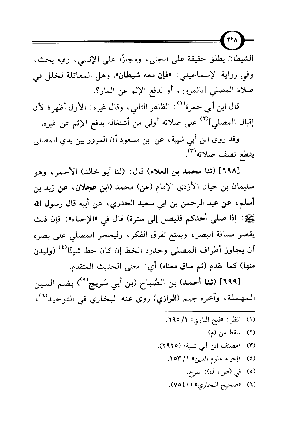 [698] (ثنا محمد بن العلاء) قال: (ثنا أبو خالد) الأحمر، وهو سليمان بن حيان الأزدي الإمام (عن) محمد (ابن عجلان، عن زيد بن أسلم، عن عبد الرحمن بن أبي سعيد الخدري، عن أبيه قال رسول الله - صلى الله عليه وسلم -: إذا صلى أحدكم فليصل إلى سترة) قال في "الإحياء": فإن ذلك يقصر مسافة البصر، ويمنع تفرق الفكر، وليحجر المصلي على بصره أن يجاوز أطراف المصلى وحدود الخط إن كان خط شيئًا (¬4) (وليدن منها) كما تقدم (ثم ساق معناه) أي: معنى الحديث المتقدم.