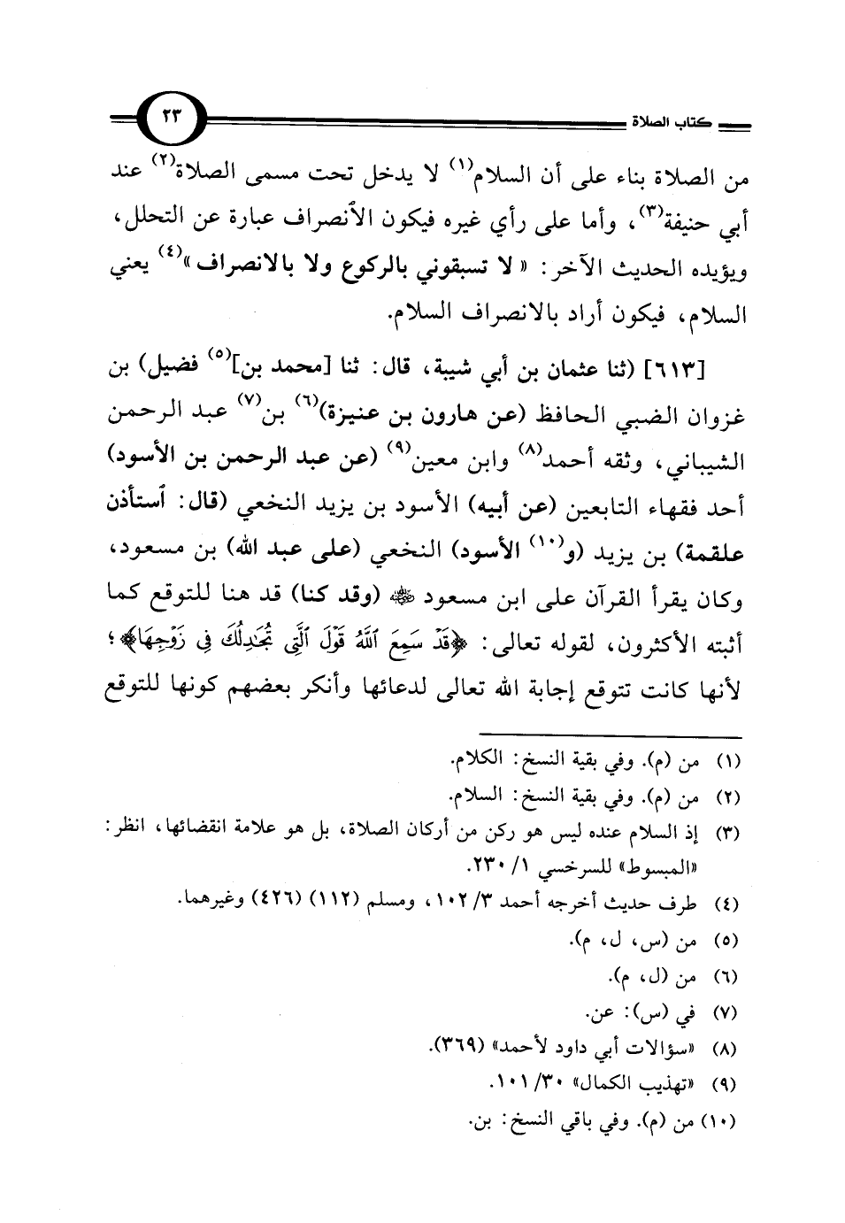 (¬3) إذ السلام عنده ليس هو ركن من أركان الصلاة، بل هو علامة انقضائها، انظر: "المبسوط" للسرخسي 1/ 230.