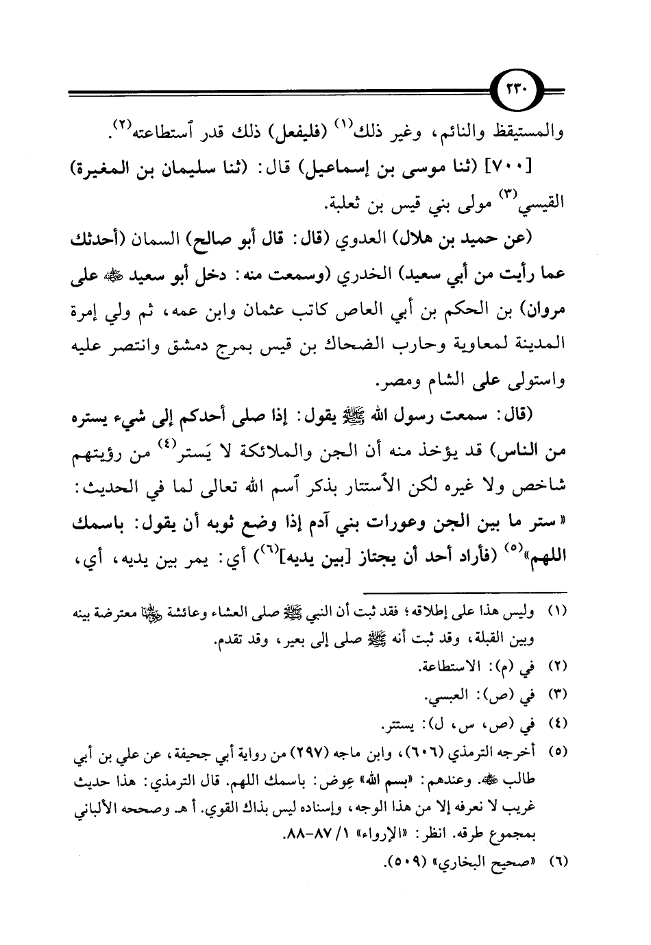(¬5) أخرجه الترمذي (606)، وابن ماجه (297) من رواية أبي جحيفة، عن علي بن أبي طالب - رضي الله عنه -. وعندهم: "بسم الله" عِوض: باسمك اللهم. قال الترمذي: هذا حديث غريب لا نعرفه إلا من هذا الوجه، وإسناده ليس بذاك القوي. أهـ. وصححه الألباني بمجموع طرقه. انظر: "الإرواء" 1/ 87 - 88.