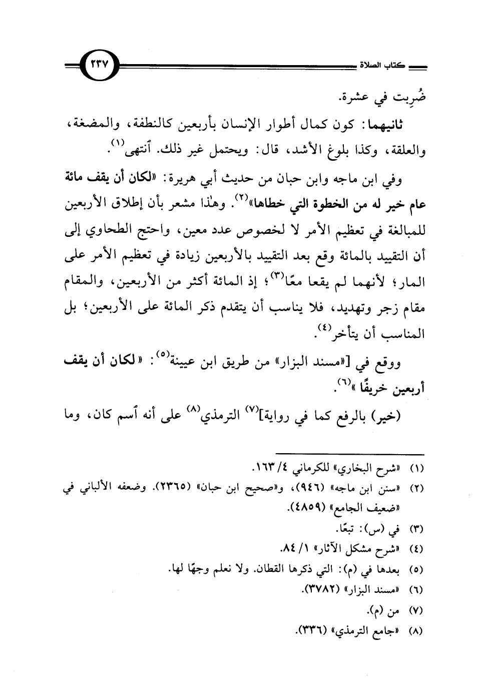 وفي ابن ماجه وابن حبان من حديث أبي هريرة: "لكان أن يقف مائة عام خير له من الخطوة التي خطاها" (¬2). وهذا مشعر بأن إطلاق الأربعين للمبالغة في تعظيم الأمر لا لخصوص عدد معين، واحتج الطحاوي إلى أن التقييد بالمائة وقع بعد التقييد بالأربعين زيادة في تعظيم الأمر على المار؛ لأنهما لم يقعا معًا (¬3)؛ إذ المائة أكثر من الأربعين، والمقام مقام زجر وتهديد، فلا يناسب أن يتقدم ذكر المائة على الأربعين؛ بل المناسب أن يتأخر (¬4).