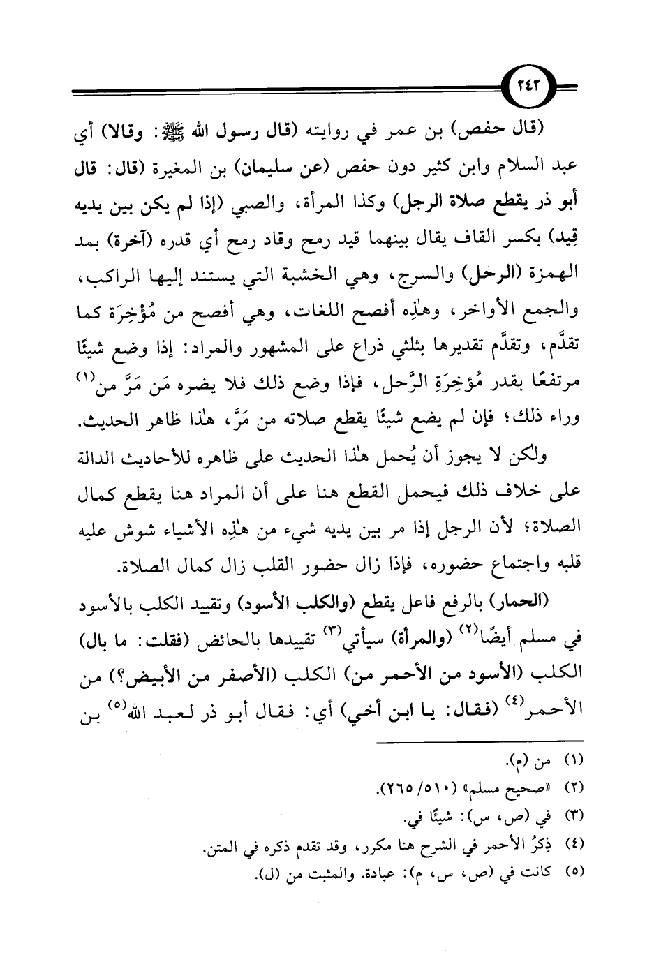 ولكن لا يجوز أن يُحمل هذا الحديث على ظاهره للأحاديث الدالة على خلاف ذلك فيحمل القطع هنا على أن المراد هنا يقطع كمال الصلاة؛ لأن الرجل إذا مر بين يديه شيء من هذِه الأشياء شوش عليه قلبه واجتماع حضوره، فإذا زال حضور القلب زال كمال الصلاة.