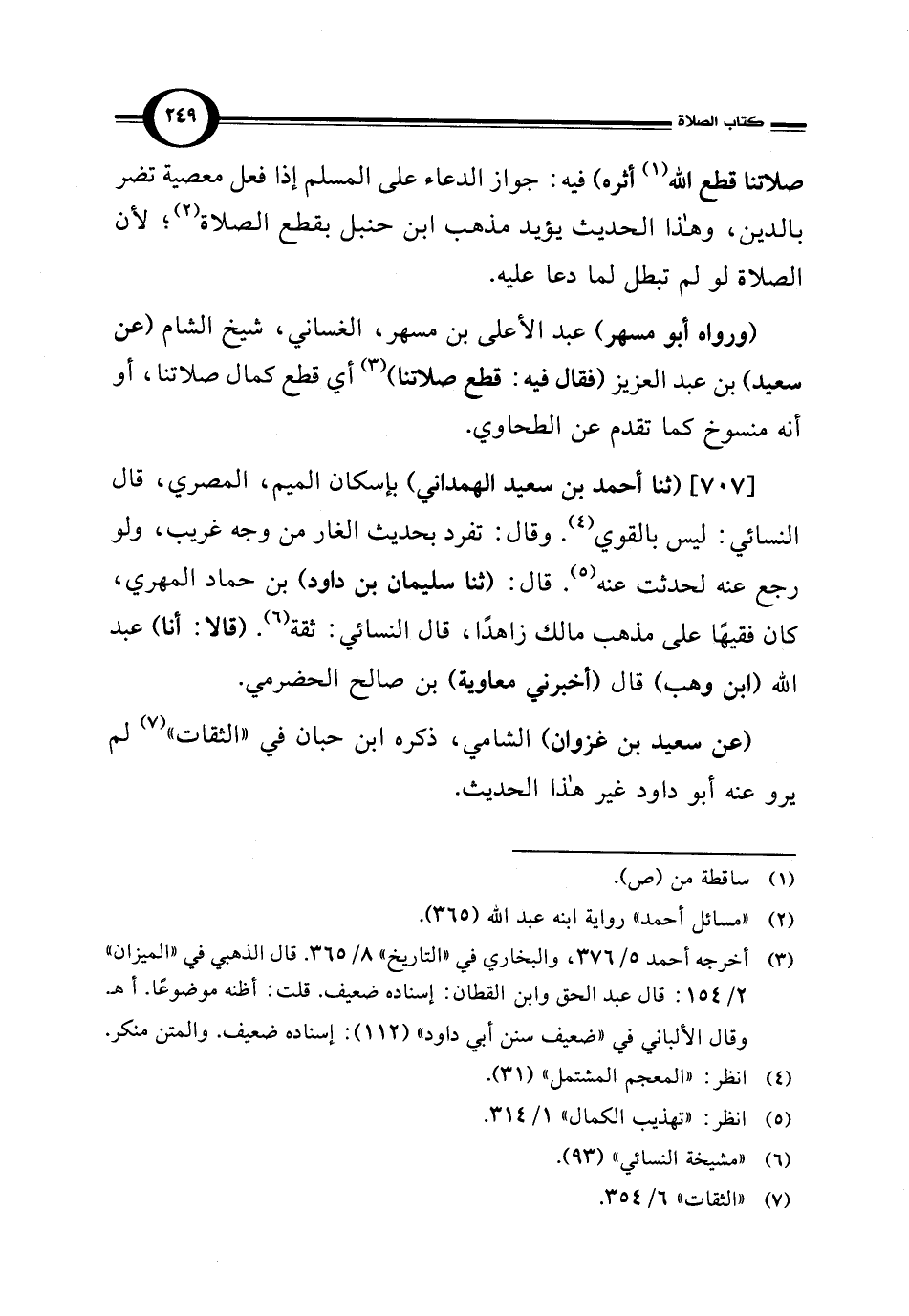 (ورواه أبو مسهر) عبد الأعلى بن مسهر، الغساني، شيخ الشام (عن سعيد) بن عبد العزيز (فقال فيه: قطع صلاتنا) (¬3) أي قطع كمال صلاتنا، أو أنه منسوخ كما تقدم عن الطحاوي.