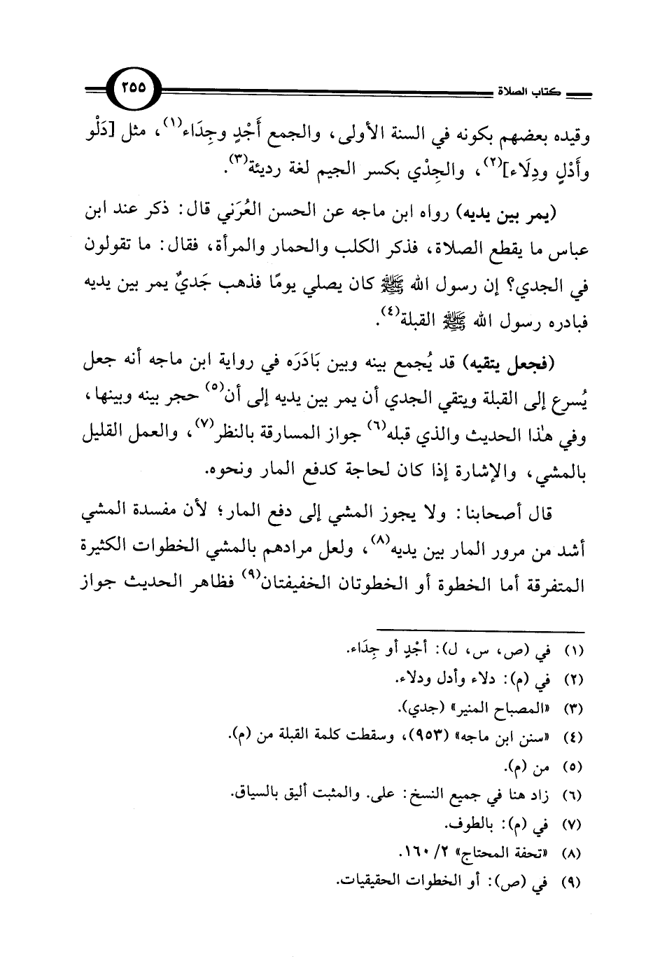 (يمر بين يديه) رواه ابن ماجه عن الحسن العُرَني قال: ذكر عند ابن عباس ما يقطع الصلاة، فذكر الكلب والحمار والمرأة، فقال: ما تقولون في الجدي؟ إن رسول الله - صلى الله عليه وسلم - كان يصلي يومًا فذهب جَديٌ يمر بين يديه فبادره رسول الله - صلى الله عليه وسلم - القبلة (¬4).