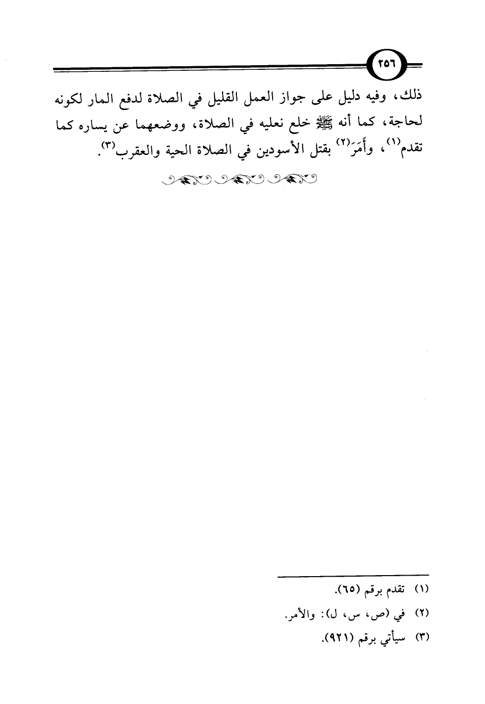 ذلك، وفيه دليل على جواز العمل القليل في الصلاة لدفع المار لكونه لحاجة، كما أنه - صلى الله عليه وسلم - خلع نعليه في الصلاة، ووضعهما عن يساره كما تقدم (¬1)، وأَمَرَ (¬2) بقتل الأسودين في الصلاة الحية والعقرب (¬3).