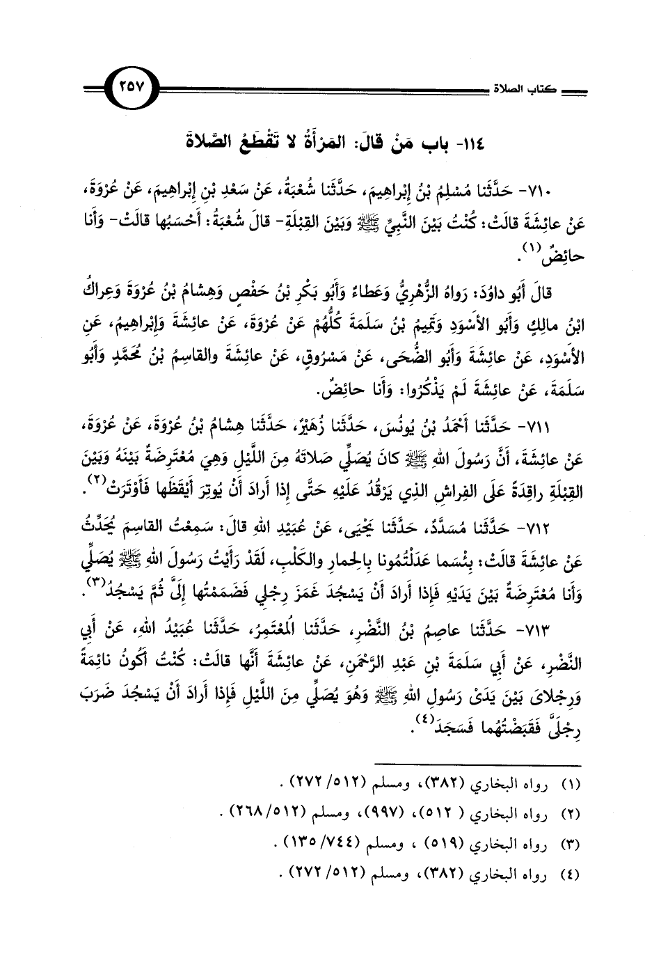 710 - حَدَّثَنا مسْلِمُ بْنُ إِبْراهِيمَ، حَدَّثَنا شُعْبَةُ، عَنْ سَعْدِ بْنِ إِبْراهِيمَ، عَنْ عُرُوَةَ، عَنْ عائِشَةَ قالتْ: كنْت بَيْنَ النَّبِيِّ - صلى الله عليه وسلم - وَبَيْنَ القِبْلَةِ -قال شعْبَة: أَحْسَبُها قالتْ- وَأَنا حائِضٌ (¬1).
