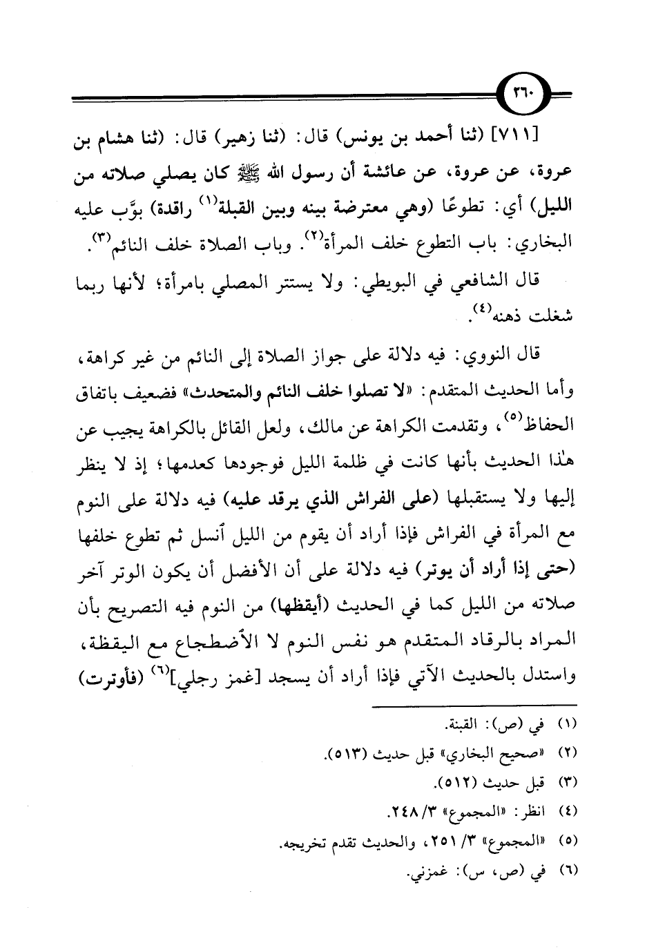 [711] (ثنا أحمد بن يونس) قال: (ثنا زهير) قال: (ثنا هشام بن عروة، عن عروة، عن عائشة أن رسول الله - صلى الله عليه وسلم - كان يصلي صلاته من الليل) أي: تطوعًا (وهي معترضة بينه وبين القبلة (¬1) راقدة) بوَّب عليه البخاري: باب التطوع خلف المرأة (¬2). وباب الصلاة خلف النائم (¬3).