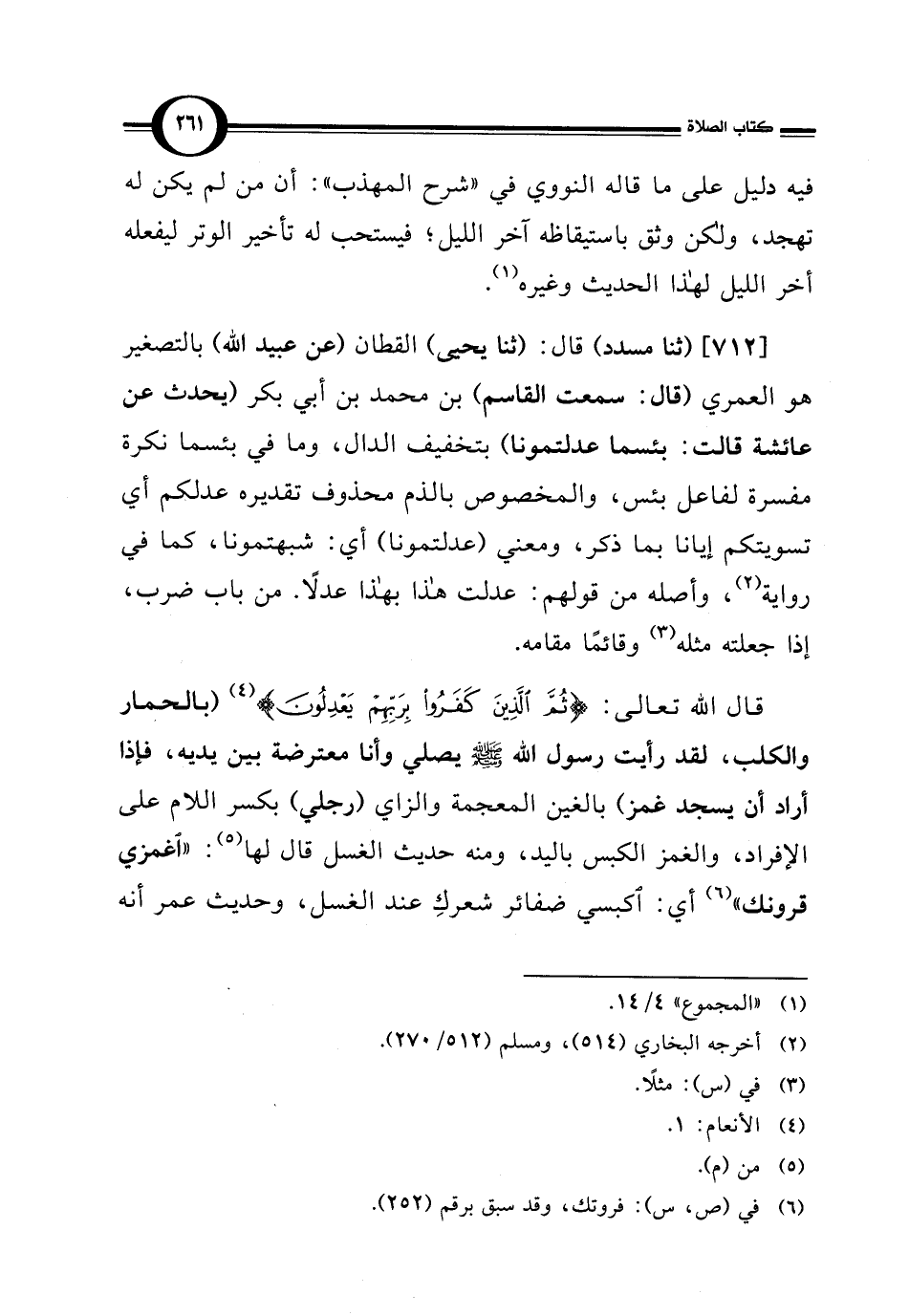 [712] (ثنا مسدد) قال: (ثنا يحيى) القطان (عن عبيد الله) بالتصغير هو العمري (قال: سمعت القاسم) بن محمد بن أبي بكر (يحدث عن عائشة قالت: بئسما عدلتمونا) بتخفيف الدال، وما في بئسما نكرة مفسرة لفاعل بئس، والمخصوص بالذم محذوف تقديره عدلكم أي تسويتكم إيانا بما ذكر، ومعني (عدلتمونا) أي: شبهتمونا، كما في رواية (¬2)، وأصله من قولهم: عدلت هذا بهذا عدلًا. من باب ضرب، إذا جعلته مثله (¬3) وقائمًا مقامه.