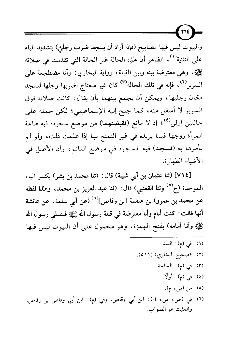 [714] (ثنا عثمان بن أبي شيبة) قال: (ثنا محمد بن بشر) بكسر الباء الموحدة (ح (¬5) وثنا القعنبي) قال: (ثنا عبد العزيز بن محمد، وهذا لفظه عن محمد بن عمرو) بن علقمة [بن وقاص] (¬6) (عن أبي سلمة، عن عائشة أنها قالت: كنت أنام وأنا معترضة في قبلة رسول الله - صلى الله عليه وسلم - فيصلي رسول الله - صلى الله عليه وسلم - وأنا أمامه) بفتح الهمزة، وهو محمول على أن البيوت ليس فيها