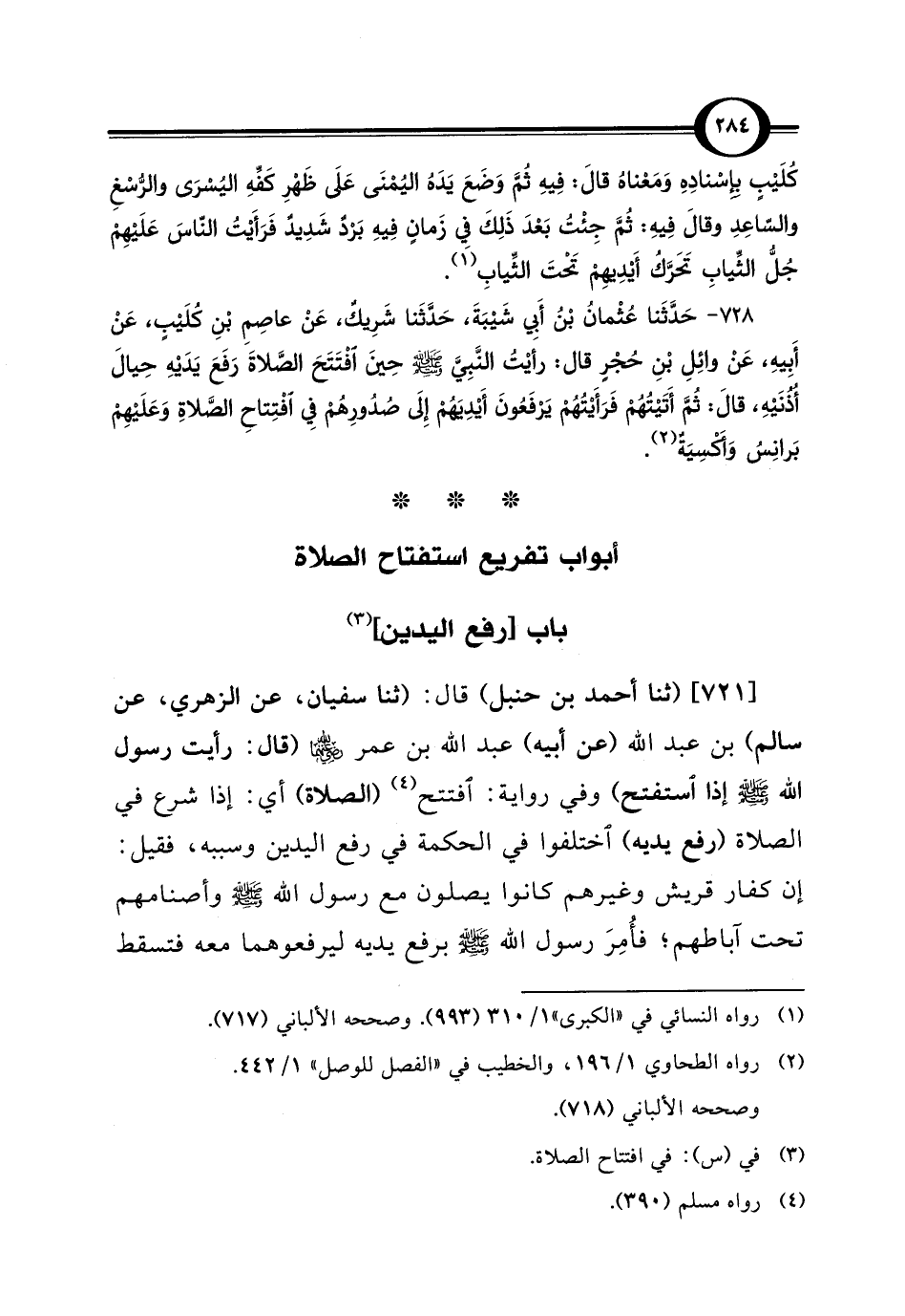 [721] (ثنا أحمد بن حنبل) قال: (ثنا سفيان، عن الزهري، عن سالم) بن عبد الله (عن أبيه) عبد الله بن عمر - رضي الله عنهما - (قال: رأيت رسول الله - صلى الله عليه وسلم - إذا استفتح) وفي رواية: افتتح (¬4) (الصلاة) أي: إذا شرع في الصلاة (رفع يديه) اختلفوا في الحكمة في رفع اليدين وسببه، فقيل: إن كفار قريش وغيرهم كانوا يصلون مع رسول الله - صلى الله عليه وسلم - وأصنامهم تحت آباطهم؛ فأُمِرَ رسول الله - صلى الله عليه وسلم - برفع يديه ليرفعوهما معه فتسقط