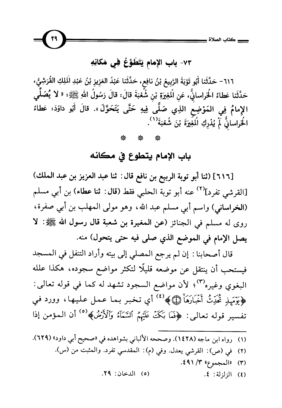 616 - حَدَّثَنا أَبُو تَوْبَةَ الرَّبِيعُ بْنُ نافِعٍ، حَدَّثَنا عَبْدُ العَريزِ بْنُ عَبْدِ الْمَلِكِ القُرَشِيُّ، حَدَّثَنا عطَاءٌ الخُراسانِيُّ، عَنِ المُغِيرَةِ بْنِ شُعْبَةَ قال: قال رَسُولُ اللهِ - صلى الله عليه وسلم -: "لا يُصَلِّي الإِمامُ في المَوْضِعِ الذِي صَلَّى فِيهِ حَتَّى يَتَحَوَّلَ". قال أبو داوُدَ: عطَاءٌ الخُراسانيُّ لَمْ يُدْرِكِ المغِيرَةَ بْنَ شُعْبَةَ (¬1).