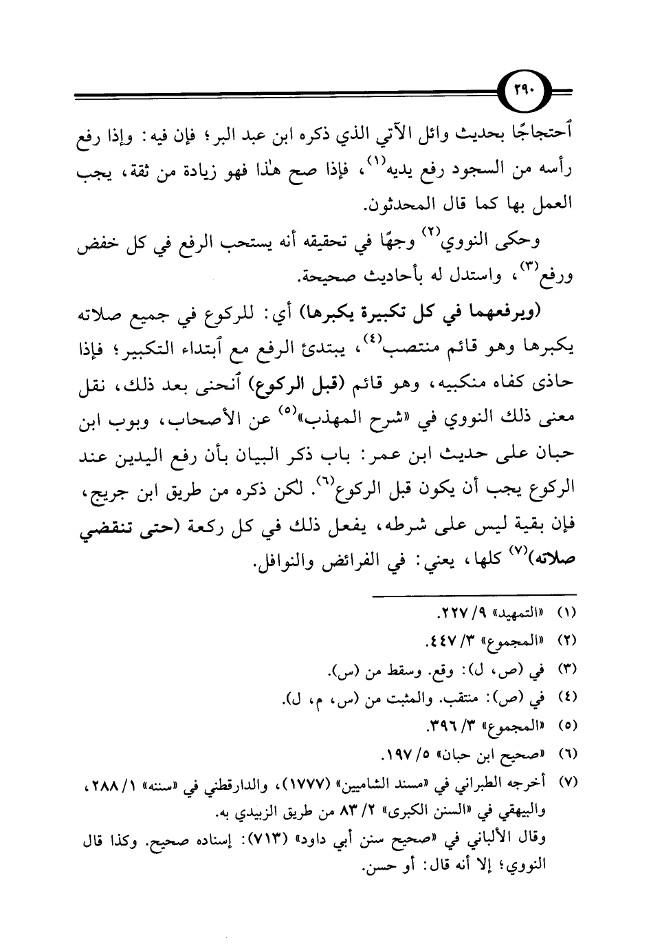 احتجاجًا بحديث وائل الآتي الذي ذكره ابن عبد البر؛ فإن فيه: وإذا رفع رأسه من السجود رفع يديه (¬1)، فإذا صح هذا فهو زيادة من ثقة، يجب العمل بها كما قال المحدثون.
