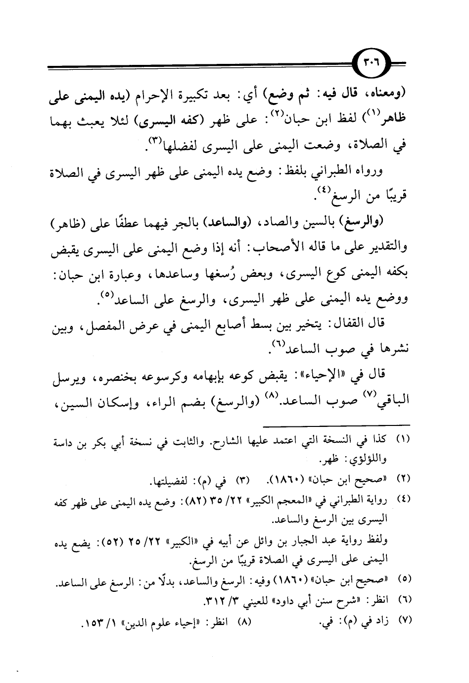 (والرسغ) بالسين والصاد، (والساعد) بالجر فيهما عطفًا على (ظاهر) والتقدير على ما قاله الأصحاب: أنه إذا وضع اليمنى على اليسرى يقبض بكفه اليمنى كوع اليسرى، وبعض رُسغها وساعدها، وعبارة ابن حبان: ووضع يده اليمنى على ظهر اليسرى، والرسغ على الساعد (¬5).