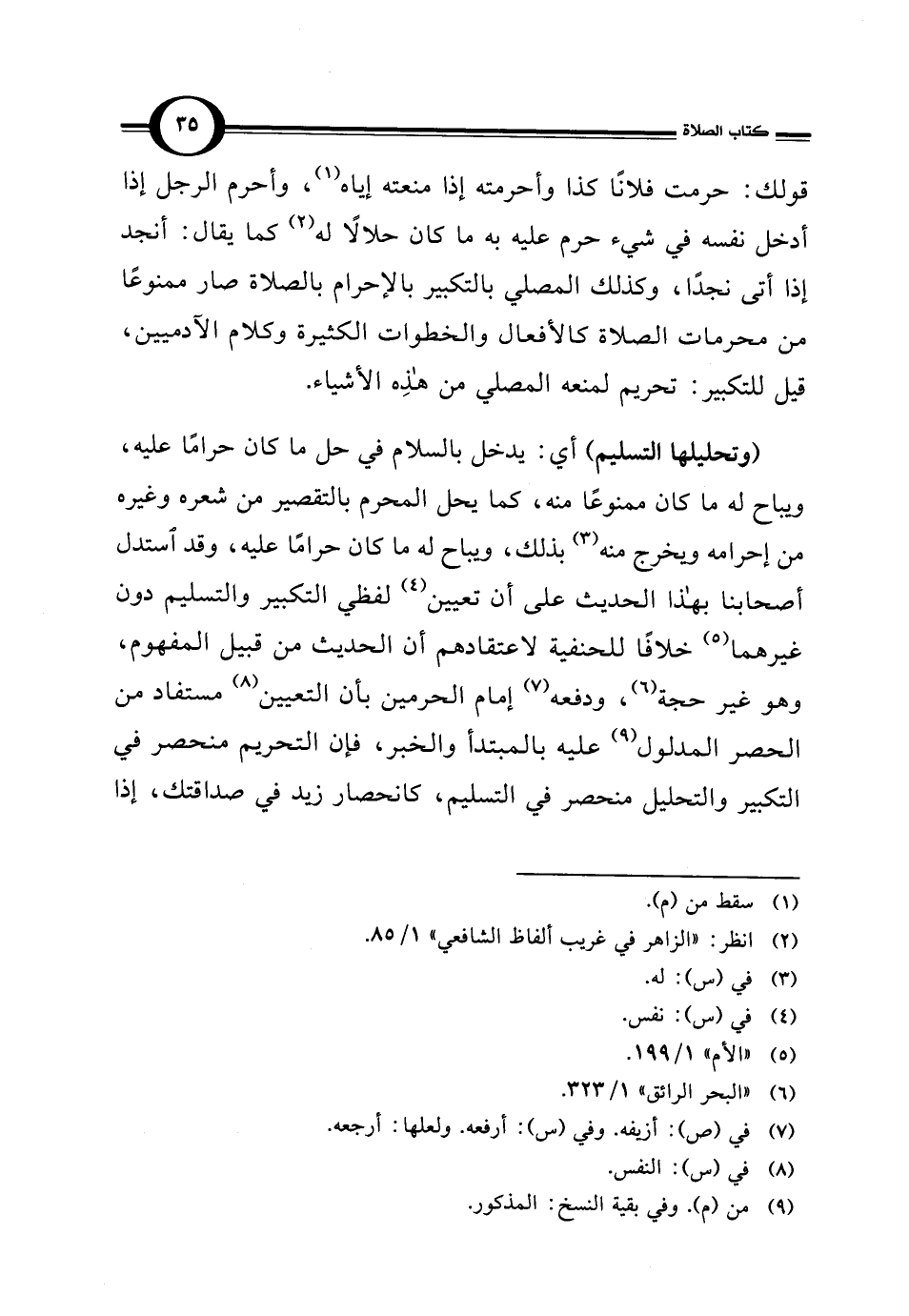(وتحليلها التسليم) أي: يدخل بالسلام في حل ما كان حرامًا عليه، ويباح له ما كان ممنوعًا منه، كما يحل المحرم بالتقصير من شعره وغيره من إحرامه ويخرج منه (¬3) بذلك، ويباح له ما كان حرامًا عليه، وقد استدل أصحابنا بهذا الحديث على أن تعيين (¬4) لفظي التكبير والتسليم دون غيرهما (¬5) خلافًا للحنفية لاعتقادهم أن الحديث من قبيل المفهوم، وهو غير حجة (¬6)، ودفعه (¬7) إمام الحرمين بأن التعيين (¬8) مستفاد من الحصر المدلول (¬9) عليه بالمبتدأ والخبر، فإن التحريم منحصر في التكبير والتحليل منحصر في التسليم، كانحصار زيد في صداقتك، إذا