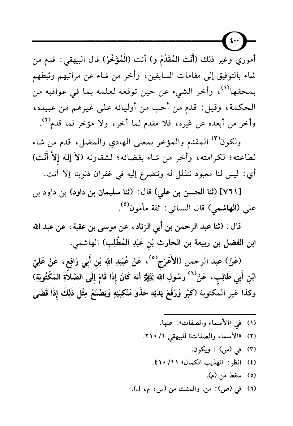 [761] (ثنا الحسن بن علي) قال: (ثنا سليمان بن داود) بن داود بن علي (الهاشمي) قال النسائي: ثقة مأمون (¬4).