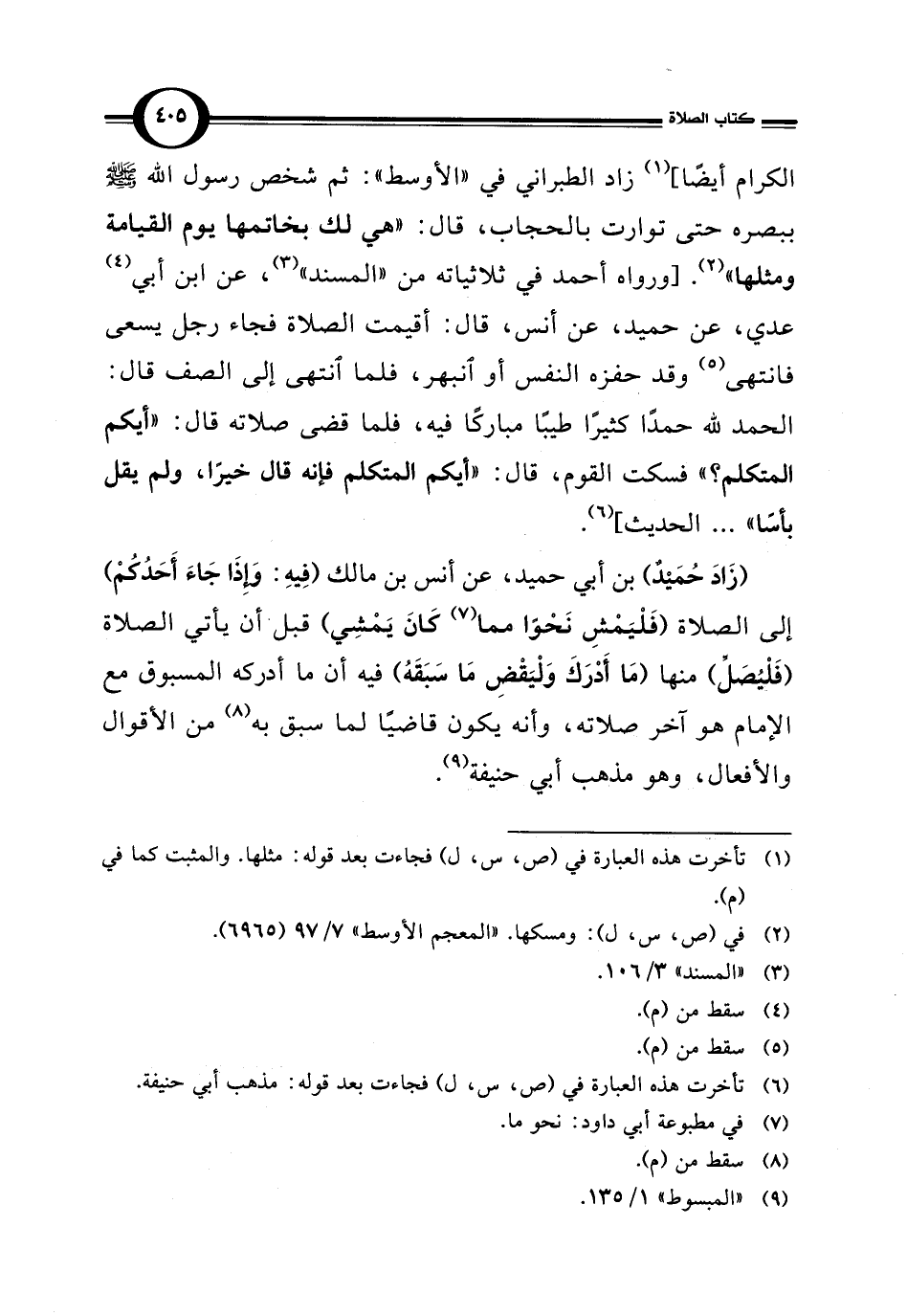 الكرام أيضًا] (¬1) زاد الطبراني في "الأوسط": ثم شخص رسول الله - صلى الله عليه وسلم - ببصره حتى توارت بالحجاب، قال: "هي لك بخاتمها يوم القيامة ومثلها" (¬2). [ورواه أحمد في ثلاثياته من "المسند" (¬3)، عن ابن أبي (¬4) عدي، عن حميد، عن أنس، قال: أقيمت الصلاة فجاء رجل يسعى فانتهى (¬5) وقد حفزه النفس أو انبهر، فلما انتهى إلى الصف قال: الحمد لله حمدًا كثيرًا طيبًا مباركًا فيه، فلما قضى صلاته قال: "أيكم المتكلم؟ " فسكت القوم، قال: "أيكم المتكلم فإنه قال خيرًا، ولم يقل بأسًا" ... الحديث] (¬6).