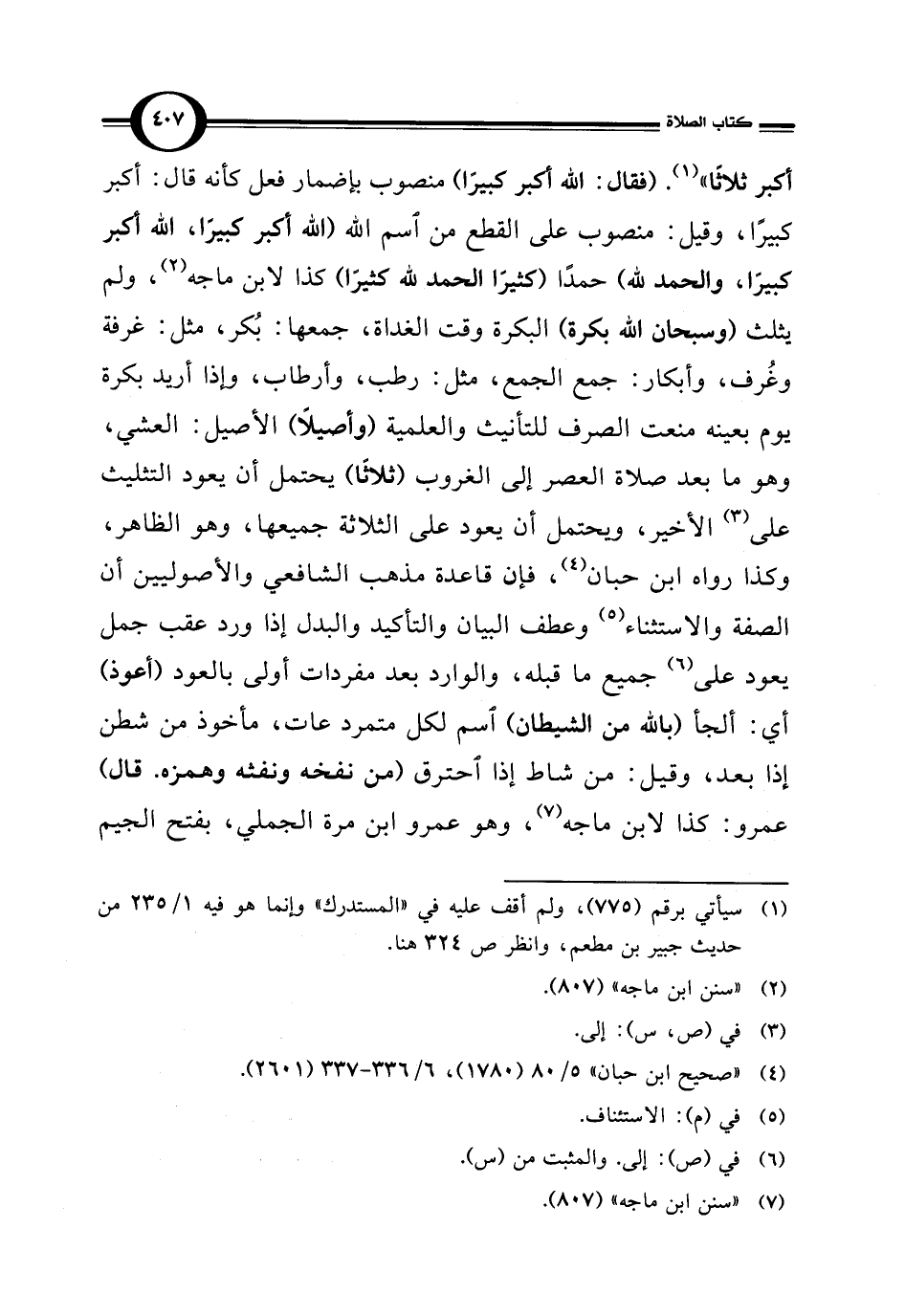أكبر ثلاثًا" (¬1). (فقال: الله أكبر كبيرًا) منصوب بإضمار فعل كأنه قال: أكبر كبيرًا، وقيل: منصوب على القطع من اسم الله (الله أكبر كبيرًا، الله أكبر كبيرًا، والحمد لله) حمدًا (كثيرًا الحمد لله كثيرًا) كذا لابن ماجه (¬2)، ولم يثلث (وسبحان الله بكرة) البكرة وقت الغداة، جمعها: بُكر، مثل: غرفة وغُرف، وأبكار: جمع الجمع، مثل: رطب، وأرطاب، وإذا أريد بكرة يوم بعينه منعت الصرف للتأنيث والعلمية (وأصيلًا) الأصيل: العشي، وهو ما بعد صلاة العصر إلى الغروب (ثلاثًا) يحتمل أن يعود التثليث على (¬3) الأخير، ويحتمل أن يعود على الثلاثة جميعها، وهو الظاهر، وكذا رواه ابن حبان (¬4)، فإن قاعدة مذهب الشافعي والأصوليين أن الصفة والاستثناء (¬5) وعطف البيان والتأكيد والبدل إذا ورد عقب جمل يعود على (¬6) جميع ما قبله، والوارد بعد مفردات أولى بالعود (أعوذ) أي: ألجأ (بالله من الشيطان) اسم لكل متمرد عات، مأخوذ من شطن إذا بعد، وقيل: من شاط إذا احترق (من نفخه ونفثه وهمزه. قال) عمرو: كذا لابن ماجه (¬7)، وهو عمرو بن مرة الجملي، بفتح الجيم