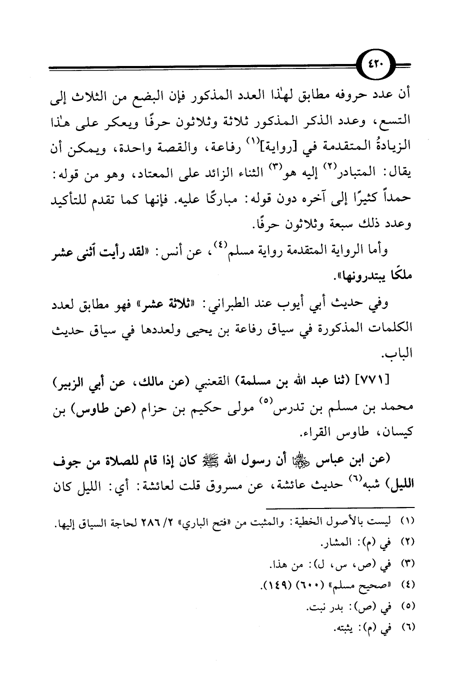 أن عدد حروفه مطابق لهذا العدد المذكور فإن البضع من الثلاث إلى التسع، وعدد الذكر المذكور ثلاثة وثلاثون حرفًا ويعكر على هذا الزيادةُ المتقدمة في [رواية] (¬1) رفاعة، والقصة واحدة، ويمكن أن يقال: المتبادر (¬2) إليه هو (¬3) الثناء الزائد على المعتاد، وهو من قوله: حمدًا كثيرًا إلى آخره دون قوله: مباركا عليه. فإنها كما تقدم للتأكيد وعدد ذلك سبعة وثلاثون حرفًا.