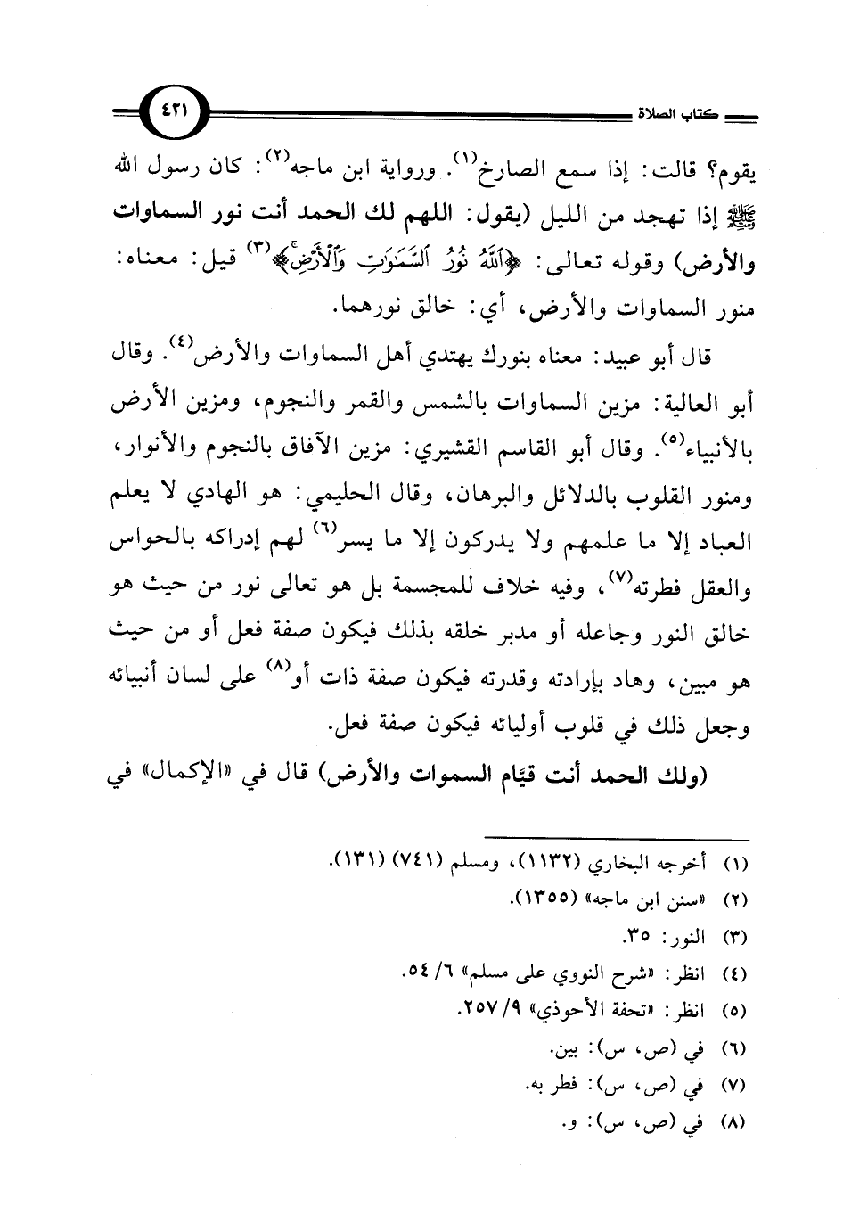 يقوم؟ قالت: إذا سمع الصارخ (¬1). ورواية ابن ماجه (¬2): كان رسول الله - صلى الله عليه وسلم - إذا تهجد من الليل (يقول: اللهم لك الحمد أنت نور السماوات والأرض) وقوله تعالى: {اللَّهُ نُورُ السَّمَاوَاتِ وَالْأَرْضِ} (¬3) قيل: معناه: منور السماوات والأرض، أي: خالق نورهما.