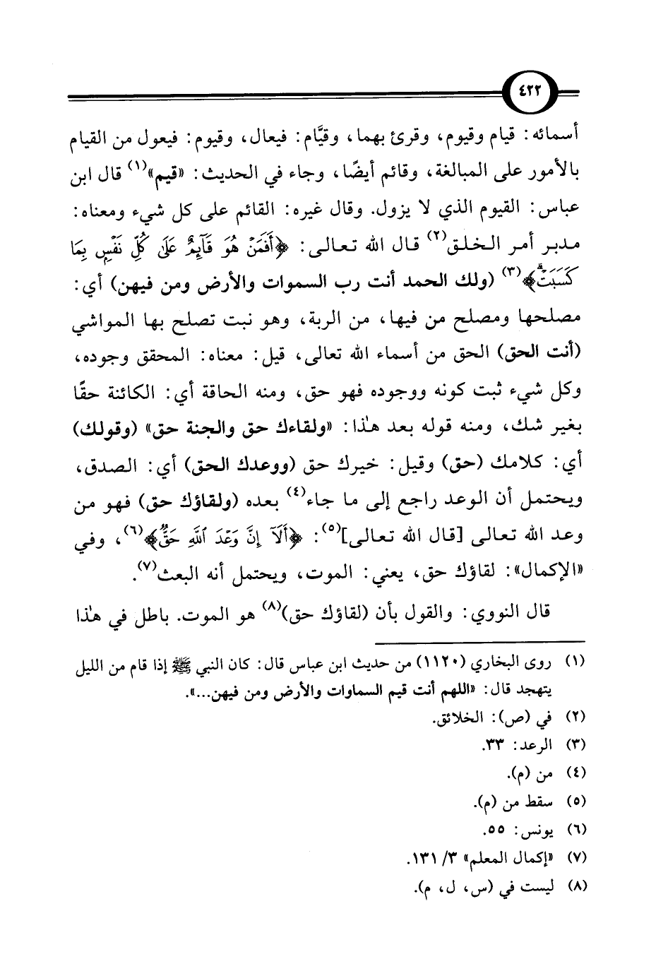 أسمائه: قيام وقيوم، وقرئ بهما، وقيَّام: فيعال، وقيوم: فيعول من القيام بالأمور على المبالغة، وقائم أيضًا، وجاء في الحديث: "قيم" (¬1) قال ابن عباس: القيوم الذي لا يزول. وقال غيره: القائم على كل شيء ومعناه: مدبر أمر الخلق (¬2) قال الله تعالى: {أَفَمَنْ هُوَ قَائِمٌ عَلَى كُلِّ نَفْسٍ بِمَا كَسَبَتْ} (¬3) (ولك الحمد أنت رب السموات والأرض ومن فيهن) أي: مصلحها ومصلح من فيها، من الربة، وهو نبت تصلح بها المواشي (أنت الحق) الحق من أسماء الله تعالى، قيل: معناه: المحقق وجوده، وكل شيء ثبت كونه ووجوده فهو حق، ومنه الحاقة أي: الكائنة حقًا بغير شك، ومنه قوله بعد هذا: "ولقاءك حق والجنة حق" (وقولك) أي: كلامك (حق) وقيل: خيرك حق (ووعدك الحق) أي: الصدق، ويحتمل أن الوعد راجع إلى ما جاء (¬4) بعده (ولقاؤك حق) فهو من وعد الله تعالى [قال الله تعالى] (¬5): {أَلَا إِنَّ وَعْدَ اللَّهِ حَقٌّ} (¬6)، وفي "الإكمال": لقاؤك حق، يعني: الموت، ويحتمل أنه البعث (¬7).