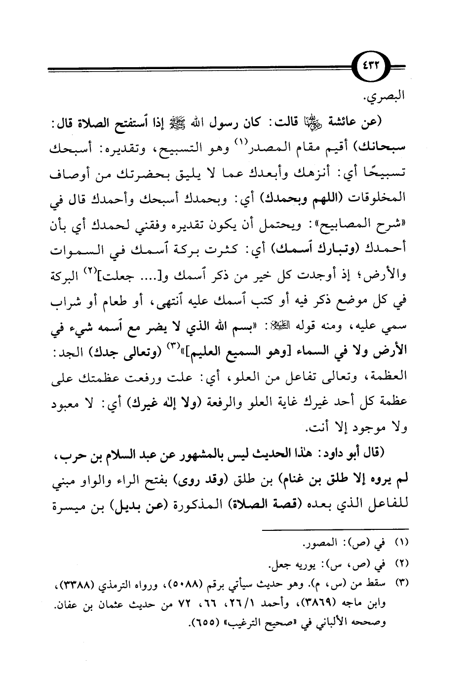 (عن عائشة - رضي الله عنها - قالت: كان رسول الله - صلى الله عليه وسلم - إذا استفتح الصلاة قال: سبحانك) أقيم مقام المصدر (¬1) وهو التسبيح، وتقديره: أسبحك تسبيحًا أي: أنزهك وأبعدك عما لا يليق بحضرتك من أوصاف المخلوقات (اللهم وبحمدك) أي: وبحمدك أسبحك وأحمدك قال في "شرح المصابيح": ويحتمل أن يكون تقديره وفقني لحمدك أي بأن أحمدك (وتبارك اسمك) أي: كثرت بركة اسمك في السموات والأرض؛ إذ أوجدت كل خير من ذكر اسمك و [ .... جعلت] (¬2) البركة في كل موضع ذكر فيه أو كتب اسمك عليه انتهى، أو طعام أو شراب سمي عليه، ومنه قوله عليه السلام: "بسم الله الذي لا يضر مع اسمه شيء في الأرض ولا في السماء [وهو السميع العليم] " (¬3) (وتعالى جدك) الجد: العظمة، وتعالى تفاعل من العلو، أي: علت ورفصت عظمتك على عظمة كل أحد غيرك غاية العلو والرفعة (ولا إله غيرك) أي: لا معبود ولا موجود إلا أنت.