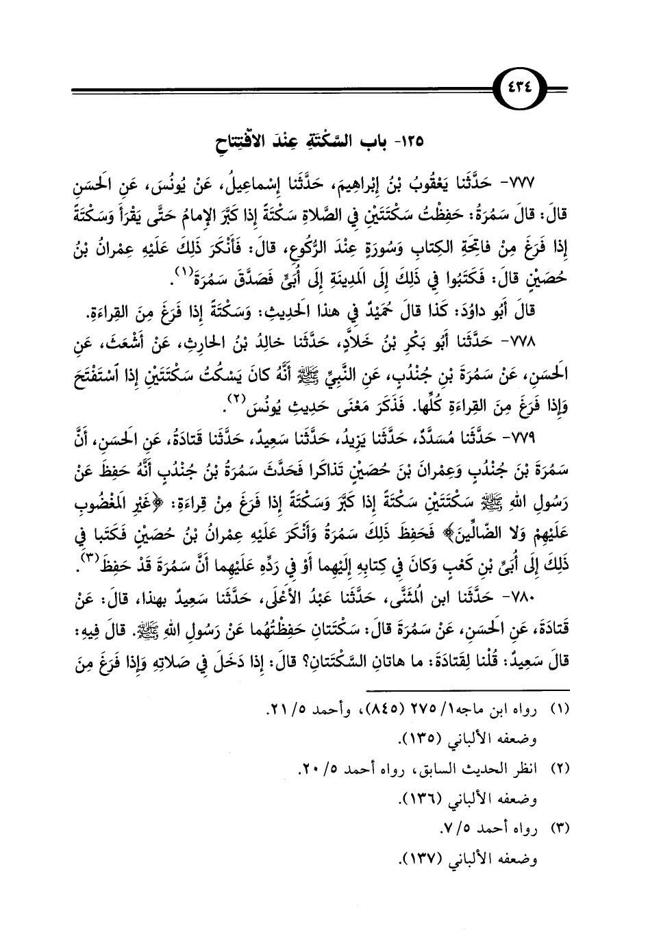 77 - حَدَّثَنا يَعْقُوبُ بْن إِبْراهِيمَ، حَدَّثَنا إِسْماعِيلُ، عَنْ يُونُسَ، عَنِ الحَسَنِ قال: قال سَمُرَةُ: حَفِظْتُ سَكْتَتَيْنِ فِي الصَّلاةِ سَكْتَةً إِذا كَبَّرَ الإِمامُ حَتَّى يَقْرَأَ وَسَكْتَةً إِذا فَرَغَ مِنْ فاتِحَةِ الكِتابِ وَسُورَةٍ عِنْدَ الرّكُوعِ، قال: فَأَنْكَرَ ذَلِكَ عَلَيْهِ عِمْرانُ بْنُ حُصَيْنٍ قال: فَكَتَبُوا فِي ذَلِكَ إِلَى المَدِينَةِ إِلَى أُبَيٍّ فَصَدَّقَ سَمُرَةَ (¬1).