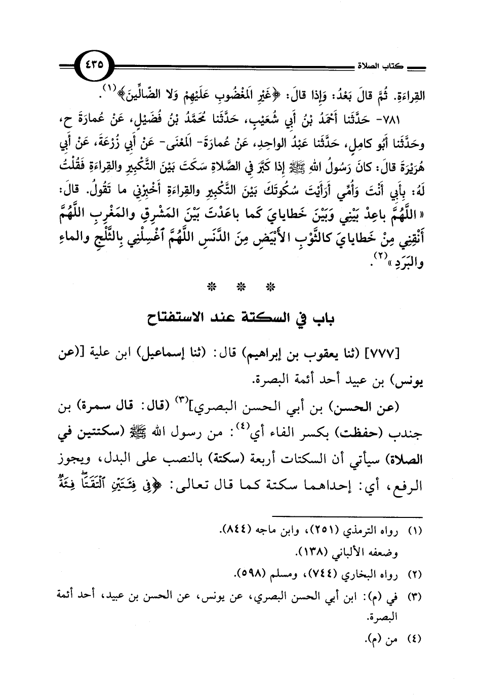 (عن الحسن) بن أبي الحسن البصري] (¬3) (قال: قال سمرة) بن جندب (حفظت) بكسر الفاء أي (¬4): من رسول الله - صلى الله عليه وسلم - (سكتتين في الصلاة) سيأتي أن السكتات أربعة (سكتة) بالنصب على البدل، ويجوز الرفع، أي: إحداهما سكتة كما قال تعالى: {فِي فِئَتَيْنِ الْتَقَتَا فِئَةٌ