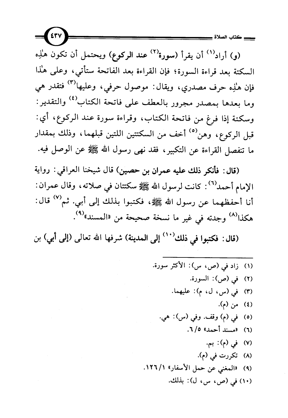 (قال: فأنكر ذلك عليه عمران بن حصين) قال شيخنا العراقي: رواية الإمام أحمد (¬6): كانت لرسول الله - صلى الله عليه وسلم - سكتتان في صلاته، وقال عمران: أنا أحفظهما عن رسول الله - صلى الله عليه وسلم -، فكتبوا بذلك إلى أبي. ثم (¬7) قال: هكذا (¬8) وجدته في غير ما نسخة صحيحة من "المسند" (¬9).