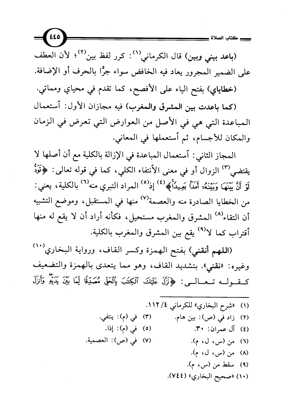 (كما باعدت بين المشرق والمغرب) فيه مجازان الأول: استعمال المباعدة التي هي في الأصل من العوارض التي تعرض في الزمان والمكان للأجسام، ثم استعملها في المعاني.