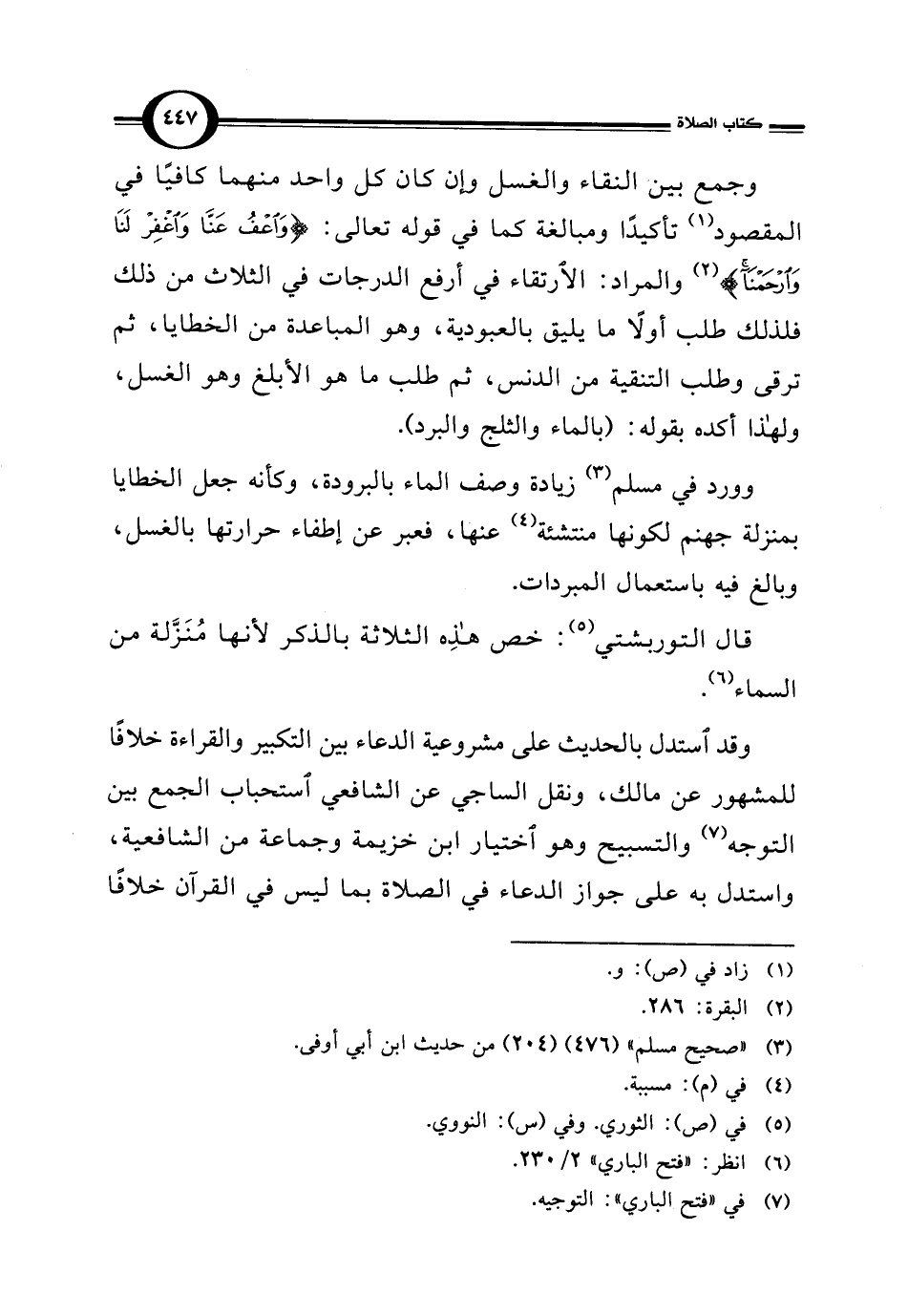 وجمع بين النقاء والغسل وإن كان كل واحد منهما كافيًا في المقصود (¬1) تأكيدًا ومبالغة كما في قوله تعالى: {وَاعْفُ عَنَّا وَاغْفِرْ لَنَا وَارْحَمْنَا} (¬2) والمراد: الارتقاء في أرفع الدرجات في الثلاث من ذلك فلذلك طلب أولًا ما يليق بالعبودية، وهو المباعدة من الخطايا، ثم ترقى وطلب التنقية من الدنس، ثم طلب ما هو الأبلغ وهو الغسل، ولهذا أكده بقوله: (بالماء والثلج والبرد).