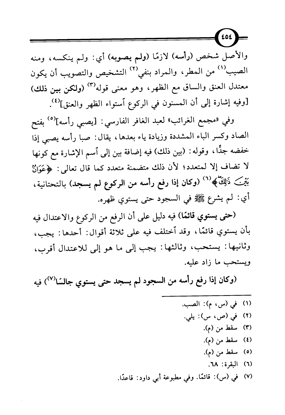وفي "مجمع الغرائب" لعبد الغافر الفارسي: [يصبي رأسه] (¬5) بفتح الصاد وكسر الباء المشددة وزيادة ياء بعدها، يقال: صبا رأسه يصبي إذا خفضه جدًّا، وقوله: (بين ذلك) فيه إضافة بين إلى اسم الإشارة مع كونها لا تضاف إلا لمتعدد؛ لأن ذلك متضمنة متعدد كما قال تعالى: {عَوَانٌ بَيْنَ ذَلِكَ} (¬6) (وكان إذا رفع رأسه من الركوع لم يسجد) بالتحتانية، أي: لم يشرع - صلى الله عليه وسلم - في السجود حتى يستوي ظهره.