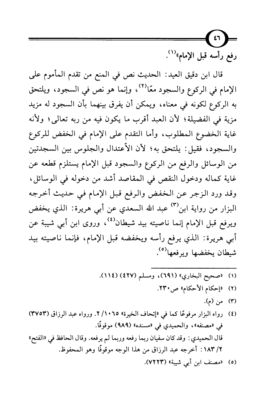 قال ابن دقيق العيد: الحديث نص في المنع من تقدم المأموم على الإمام في الركوع والسجود معًا (¬2)، وإنما هو نص في السجود، ويلتحق به الركوع لكونه في معناه، ويمكن أن يفرق بينهما بأن السجود له مزيد مزية في الفضيلة؛ لأن العبد أقرب ما يكون فيه من ربه تعالى؛ ولأنه غاية الخضوع المطلوب، وأما التقدم على الإمام في الخفض للركوع والسجود، فقيل: يلتحق به؛ لأن الاعتدال والجلوس بين السجدتين من الوسائل والرفع من الركوع والسجود قبل الإمام يستلزم قطعه عن غاية كماله ودخول النقص في المقاصد أشد من دخوله في الوسائل، وقد ورد الزجر عن الخفض والرفع قبل الإمام في حديث أخرجه البزار من رواية ابن (¬3) عبد الله السعدي عن أبي هريرة: الذي يخفض ويرفع قبل الإمام إنما ناصيته بيد شيطان (¬4)، وروى ابن أبي شيبة عن أبي هريرة: الذي يرفع رأسه ويخفضه قبل الإمام، فإنما ناصيته بيد شيطان يخفضها ويرفعها (¬5).