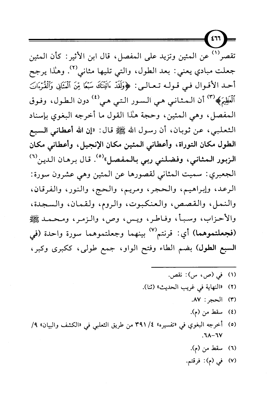 تقصر (¬1) عن المئين وتزيد على المفصل، قال ابن الأثير: كأن المئين جعلت مبادي يعني: بعد الطول، والتي تليها مثاني (¬2). وهذا يرجح أحد الأقوال في قوله تعالى: {وَلَقَدْ آتَيْنَاكَ سَبْعًا مِنَ الْمَثَانِي وَالْقُرْآنَ الْعَظِيمَ} (¬3) أن المثاني هي السور التي هي (¬4) دون الطول، وفوق المفصل، وهي المئين، وحجة هذا القول ما أخرجه البغوي بإسناد الثعلبي، عن ثوبان، أن رسول الله - صلى الله عليه وسلم - قال: "إن الله أعطاني السبع الطول مكان التوراة، وأعطاني المئين مكان الإنجيل، وأعطاني مكان الزبور المثاني، وفضلني ربي بالمفصل" (¬5). قال برهان الدين (¬6) الجعبري: سميت المثاني لقصورها عن المئين وهي عشرون سورة: الرعد، وإبراهيم، والحجر، ومريم، والحج، والنور، والفرقان، والنمل، والقصص، والعنكبوت، والروم، ولقمان، والسجدة، والأحزاب، وسبأ، وفاطر، ويس، وص، والزمر، ومحمد - صلى الله عليه وسلم - (فجعلتموهما) أي: قرنتم (¬7) بينهما وجعلتموهما سورة واحدة (في السبع الطول) بضم الطاء وفتح الواو، جمع طولى، ككبرى وكبر،