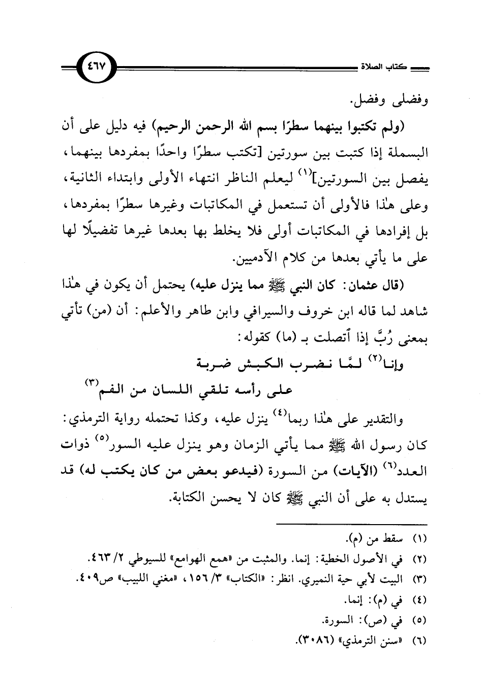 (ولم تكتبوا بينهما سطرًا بِسْمِ اللَّهِ الرَّحْمَنِ الرَّحِيمِ) فيه دليل على أن البسملة إذا كتبت بين سورتين [تكتب سطرًا واحدًا بمفردها بينهما، يفصل بين السورتين] (¬1) ليعلم الناظر انتهاء الأولى وابتداء الثانية، وعلى هذا فالأولى أن تستعمل في المكاتبات وغيرها سطرًا بمفردها، بل إفرادها في المكاتبات أولى فلا يخلط بها بعدها غيرها تفضيلًا لها على ما يأتي بعدها من كلام الآدميين.