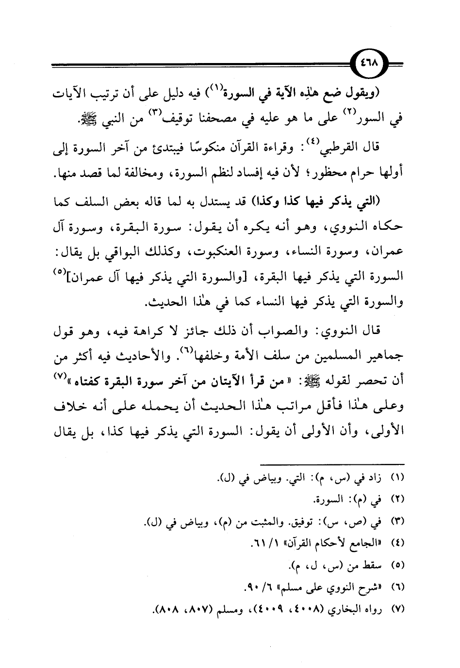 قال القرطبي (¬4): وقراءة القرآن منكوسًا فيبتدئ من آخر السورة إلى أولها حرام محظور؛ لأن فيه إفساد لنظم السورة، ومخالفة لما قصد منها.