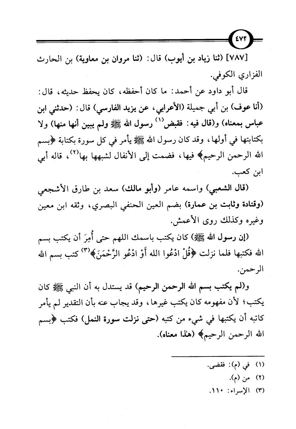 (إن رسول الله - صلى الله عليه وسلم -) كان يكتب باسمك اللهم حتى أُمِرَ أن يكتب بسم الله فكتبها فلما نزلت {قُلِ ادْعُوا اللَّهَ أَوِ ادْعُوا الرَّحْمَنَ} (¬3) كتب بسم الله الرحمن.