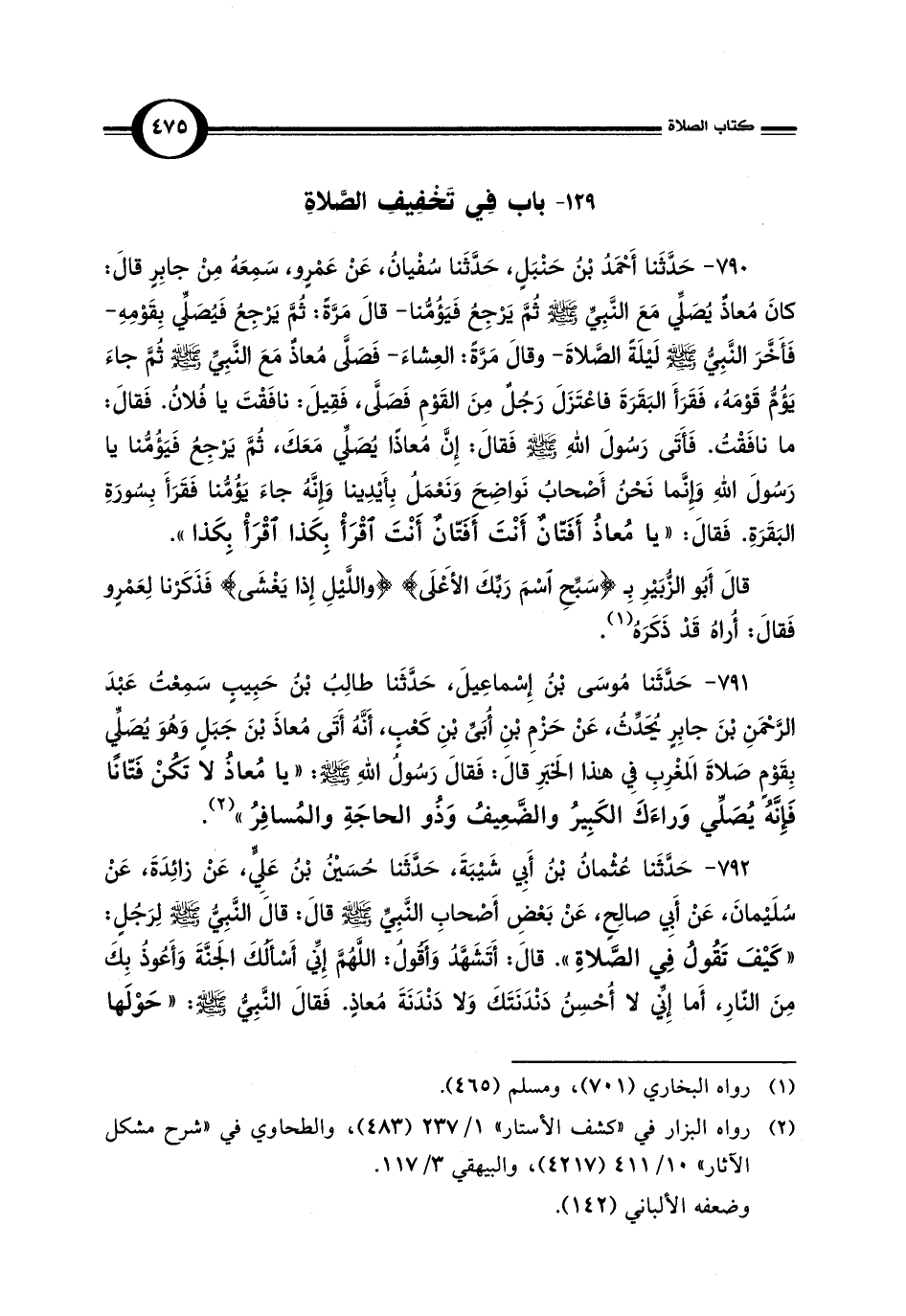 790 - حَدَّثَنا أَحْمَدُ بْنُ حَنْبَلٍ، حَدَّثَنا سُفْيانُ، عَنْ عَمْرٍو، سَمِعَهُ مِنْ جابِرٍ قال: كانَ مُعاذٌ يُصَلِّي مَعَ النَّبِيِّ - صلى الله عليه وسلم - ثُمَّ يَرْجِعُ فَيَؤُمُّنا - قال مَرَّةً: ثُمَّ يَرْجِعُ فَيُصَلِّي بِقَوْمِهِ - فَأَخَّرَ النَّبِيُّ - صلى الله عليه وسلم - لَيلَةً الصَّلاةَ - وقال مَرَّةً: العِشاءَ - فَصَلَّى مُعاذٌ مَعَ النَّبِيِّ - صلى الله عليه وسلم - ثُمَّ جاءَ يَؤُمُّ قَوْمَهُ، فَقَرَأَ البَقَرَةَ فاعْتَزَلَ رَجُلٌ مِنَ القَوْمِ فَصَلَّى، فَقِيلَ: نافَقْتَ يا فُلانُ. فَقال: ما نافَقْتُ. فَأَتَى رَسُولَ الله - صلى الله عليه وسلم - فَقال: إِنَّ مُعاذًا يُصَلِّي مَعَكَ، ثُمَّ يَرْجِعُ فَيَؤُمُّنا يا رَسُولَ الله وَإِنَّما نَحْنُ أَصْحابُ نَواضِحَ وَنَعْمَلُ بِأَيْدِينا وَإِنَّهُ جاءَ يَؤُمُّنا فَقَرَأَ بِسُورَةِ البَقَرَةِ. فَقال: "يا مُعاذُ أَفَتّانٌ أَنْتَ أَفَتّانٌ أَنْتَ اقْرَأْ بِكَذا اقْرَأْ بِكَذا".