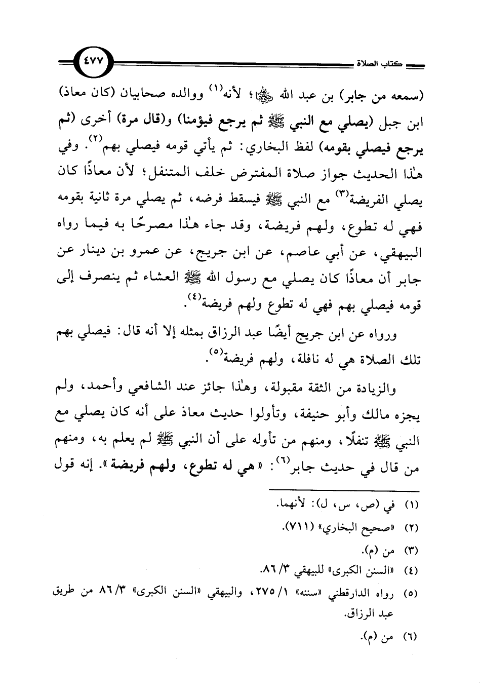 (سمعه من جابر) بن عبد الله - رضي الله عنهما -؛ لأنه (¬1) ووالده صحابيان (كان معاذ) ابن جبل (يصلي مع النبي - صلى الله عليه وسلم - ثم يرجع فيؤمنا) و (قال مرة) أخرى (ثم يرجع فيصلي بقومه) لفظ البخاري: ثم يأتي قومه فيصلي بهم (¬2). وفي هذا الحديث جواز صلاة المفترض خلف المتنفل؛ لأن معاذًا كان يصلي الفريضة (¬3) مع النبي - صلى الله عليه وسلم - فيسقط فرضه، ثم يصلي مرة ثانية بقومه فهي له تطوع، ولهم فريضة، وقد جاء هذا مصرحًا به فيما رواه البيهقي، عن أبي عاصم، عن ابن جريج، عن عمرو بن دينار عن جابر أن معاذًا كان يصلي مع رسول الله - صلى الله عليه وسلم - العشاء ثم ينصرف إلى قومه فيصلي بهم فهي له تطوع ولهم فريضة (¬4).