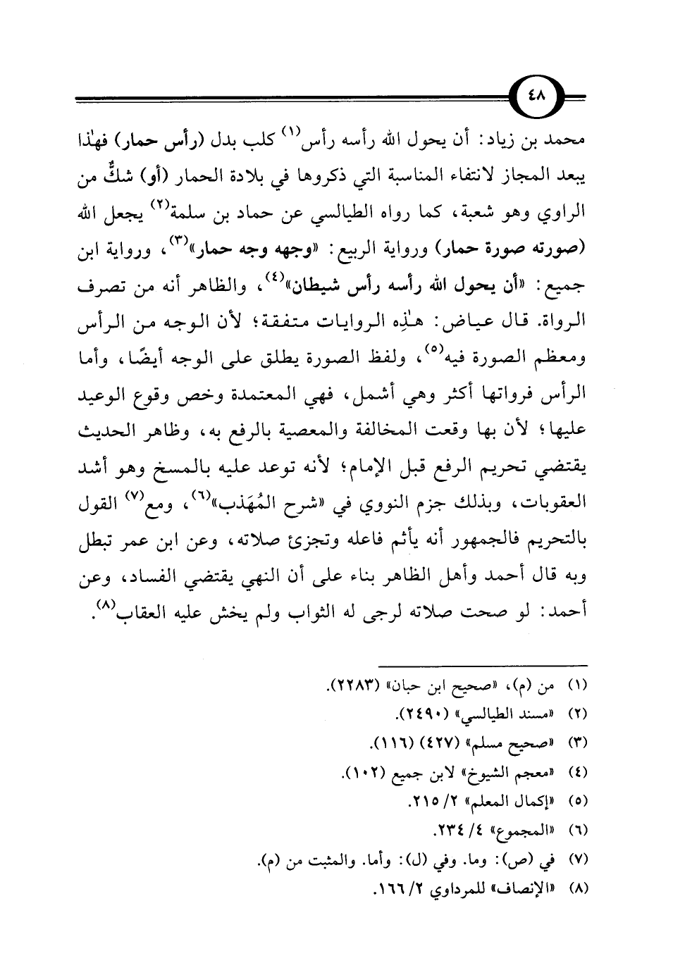 محمد بن زياد: أن يحول الله رأسه رأس (¬1) كلب بدل (رأس حمار) فهذا يبعد المجاز لانتفاء المناسبة التي ذكروها في بلادة الحمار (أو) شكٌّ من الراوي وهو شعبة، كما رواه الطيالسي عن حماد بن سلمة (¬2) يجعل الله (صورته صورة حمار) ورواية الربيع: "وجهه وجه حمار" (¬3)، ورواية ابن جميع: "أن يحول الله رأسه رأس شيطان" (¬4)، والظاهر أنه من تصرف الرواة. قال عياض: هذِه الروايات متفقة؛ لأن الوجه من الرأس ومعظم الصورة فيه (¬5)، ولفظ الصورة يطلق على الوجه أيضًا، وأما الرأس فرواتها أكثر وهي أشمل، فهي المعتمدة وخص وقوع الوعيد عليها؛ لأن بها وقعت المخالفة والمعصية بالرفع به، وظاهر الحديث يقتضي تحريم الرفع قبل الإمام؛ لأنه توعد عليه بالمسخ وهو أشد العقوبات، وبذلك جزم النووي في "شرح المُهَذب" (¬6)، ومع (¬7) القول بالتحريم فالجمهور أنه يأثم فاعله وتجزئ صلاته، وعن ابن عمر تبطل وبه قال أحمد وأهل الظاهر بناء على أن النهي يقتضي الفساد، وعن أحمد: لو صحت صلاته لرجى له الثواب ولم يخش عليه العقاب (¬8).