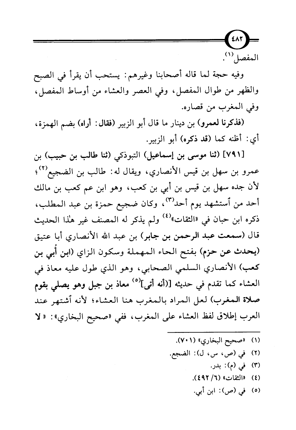 [791] (ثنا موسى بن إسماعيل) التبوذكي (ثنا طالب بن حبيب) بن عمرو بن سهل بن قيس الأنصاري، ويقال له: طالب بن الضجيع (¬2)؛ لأن جده سهل بن قيس بن أبي بن كعب، وهو ابن عم كعب بن مالك أحد من استشهد يوم أحد (¬3)، وكان ضجيع حمزة بن عبد المطلب، ذكره ابن حبان في "الثقات" (¬4) ولم يذكر له المصنف غير هذا الحديث قال (سمعت عبد الرحمن بن جابر) بن عبد الله الأنصاري أبا عتيق (يحدث عن حزم) بفتح الحاء المهملة وسكون الزاي (ابن أُبي بن كعب) الأنصاري السلمي الصحابي، وهو الذي طول عليه معاذ في العشاء كما تقدم في حديثه [(أنه أتى] (¬5) معاذ بن جبل وهو يصلي بقوم صلاة المغرب) لعل المراد بالمغرب هنا العشاء؛ لأنه اشتهر عند العرب إطلاق لفظ العشاء على المغرب، ففي "صحيح البخاري": "لا