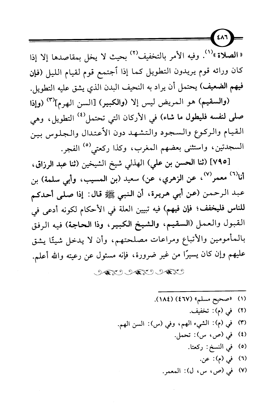 [795] (ثنا الحسن بن علي) الهذلي شيخ الشيخين (ثنا عبد الرزاق، أنا (¬6) معمر (¬7)، عن الزهري، عن) سعيد (بن المسيب، وأبي سلمة) بن عبد الرحمن (عن أبي هريرة، أن النبي - صلى الله عليه وسلم - قال: إذا صلى أحدكم للناس فليخفف؛ فإن فيهم) فيه تبيين العلة في الأحكام لكونه أدعى في القبول والعمل (السقيم، والشيخ الكبير، وذا الحاجة) فيه الرفق بالمأمومين والأتباع ومراعات مصلحتهم، وأن لا يدخل شيئًا يشق عليهم وإن كان يسيرًا من غير ضرورة، فإنه مسئول عن رعيته والله أعلم.