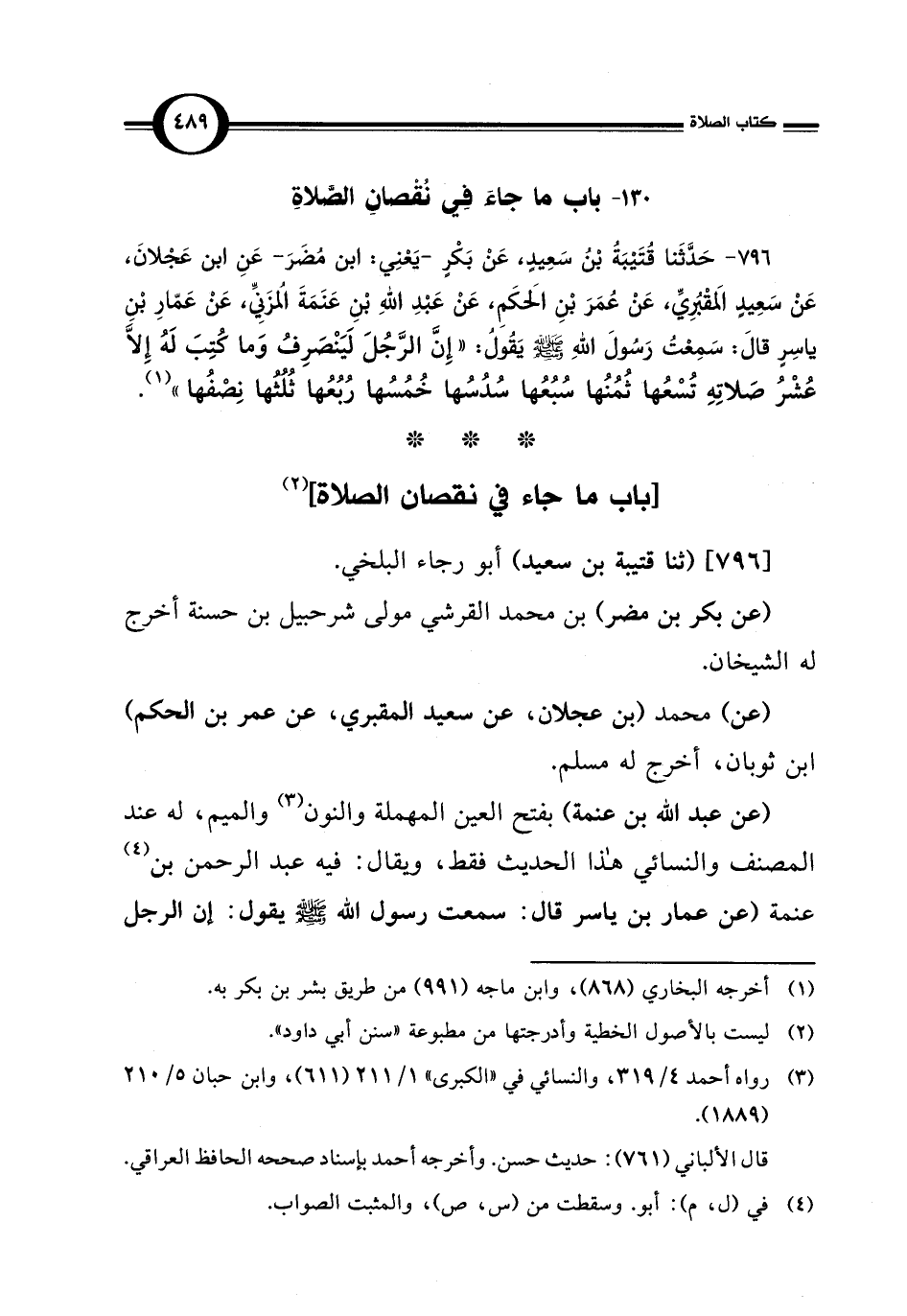 796 - حَدَّثَنا قُتَيْبَةُ بْن سَعِيدٍ، عَنْ بَكْرٍ -يَعْنِي: ابن مُضَرَ- عَنِ ابن عَجْلانَ، عَنْ سَعِيدٍ المقْبُرِيِّ، عَنْ عُمَرَ بْنِ الحَكَمِ، عَنْ عَبْدِ اللهِ بْنِ عَنَمَةَ المُزَنِيِّ، عَنْ عَمّارِ بْنِ ياسِرٍ قال: سَمِعْتُ رَسُولَ اللهِ - صلى الله عليه وسلم - يَقُولُ: "إِنَّ الرَّجُلَ لَيَنْصَرِفُ وَما كُتِبَ لَهُ إِلَّا عُشْرُ صَلاتِهِ تُسْعُها ثُمُنُها سُبُعُها سُدُسُها خُمُسُها رُبُعُها ثُلُثُها نِصْفُها" (¬1).