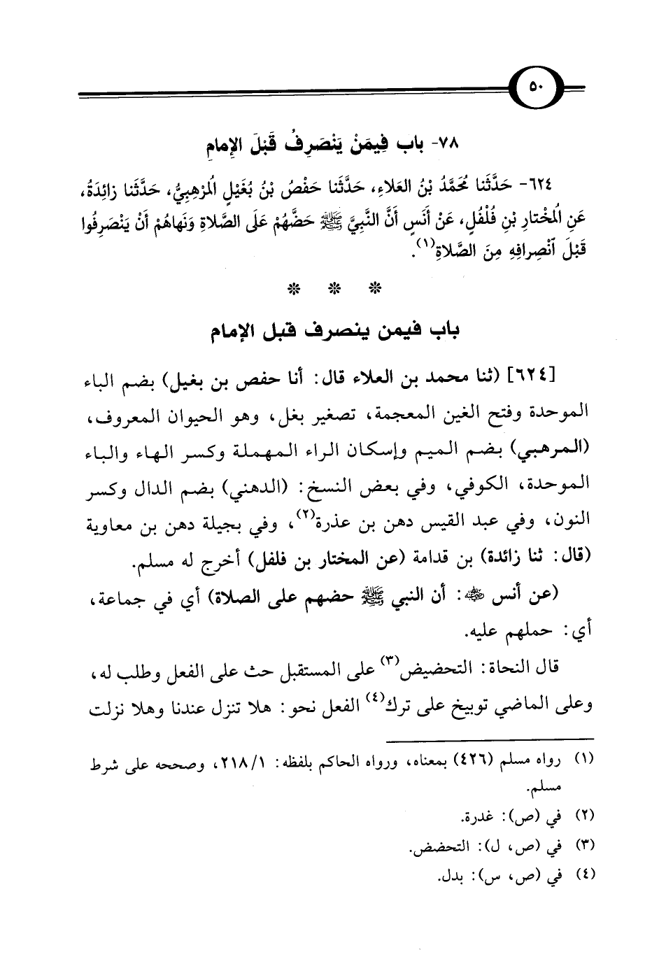 624 - حَدَّثَنا مُحَمَّدُ بْنُ العَلاءِ، حَدَّثَنا حَفْصُ بْن بُغَيْلٍ المُرْهِبِيُّ، حَدَّثَنا زائِدَةُ، عَنِ المُخْتارِ بْنِ فُلْفلٍ، عَنْ أَنَسٍ أَنَّ النَّبِيَّ - صلى الله عليه وسلم - حَضَّهُمْ عَلَى الصَّلاةِ وَنَهاهُمْ أَنْ يَنْصَرِفوا قَبْلَ انْصِرافِهِ مِنَ الصَّلاةِ (¬1).
