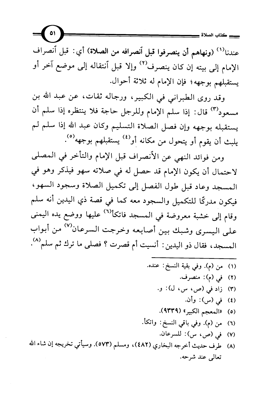 ومن فوائد النهي عن الانصراف قبل الإمام والتأخر في المصلى لاحتمال أن يكون الإمام قد حصل له في صلاته سهو فيذكر وهو في المسجد وعاد قبل طول الفصل إلى تكميل الصلاة وسجود السهو، فيكون مدركًا للتكميل والسجود معه كما في قصة ذي اليدين أنه سلم وقام إلى خشبة معروضة في المسجد فاتكأ (¬6) عليها ووضع يده اليمنى على اليسرى وشبك بين أصابعه وخرجت السرعان (¬7) من أبواب المسجد، فقال ذو اليدين: أنسيت أم قصرت؟ فصلى ما ترك ثم سلم (¬8).