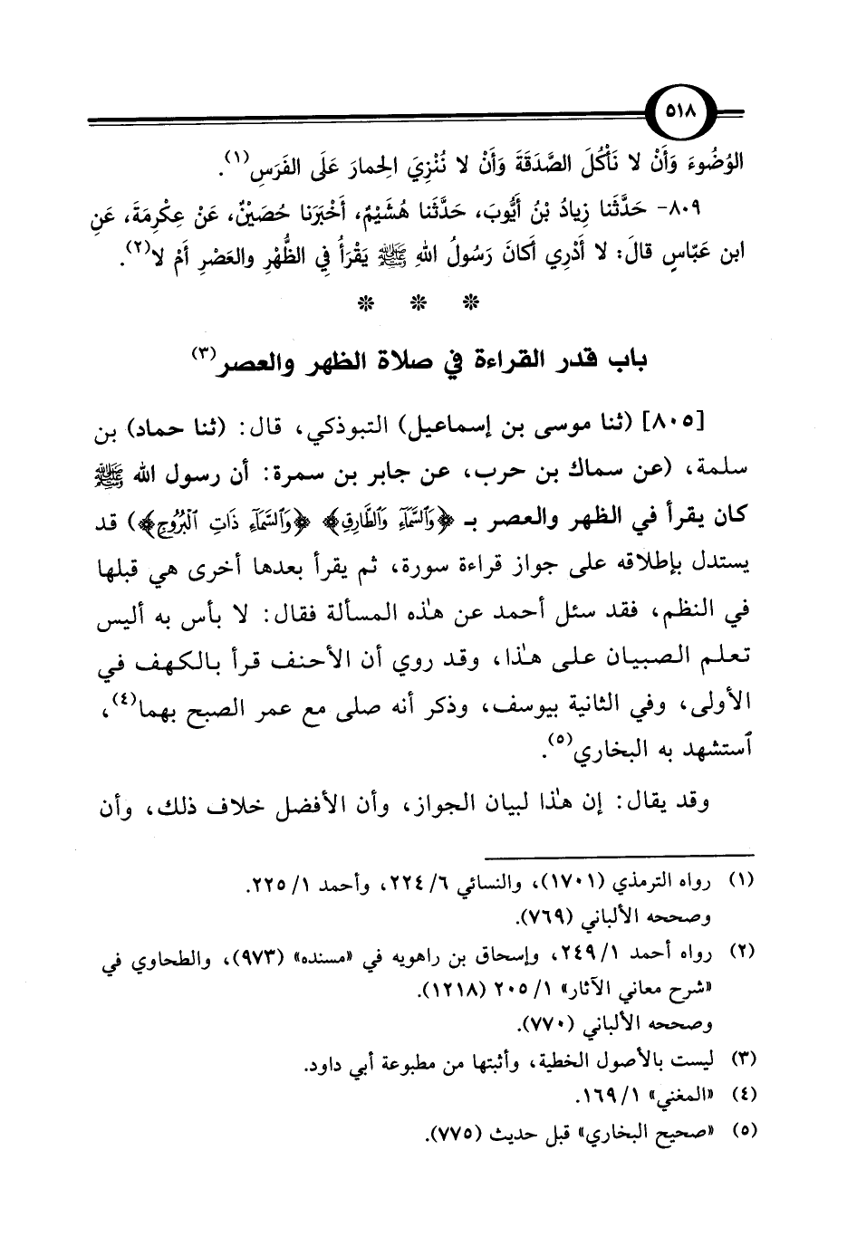 [805] (ثنا موسى بن إسماعيل) التبوذكي، قال: (ثنا حماد) بن سلمة، (عن سماك بن حرب، عن جابر بن سمرة: أن رسول الله - صلى الله عليه وسلم - كان يقرأ في الظهر والعصر بـ {وَالسَّمَاءِ وَالطَّارِقِ} {وَالسَّمَاءِ ذَاتِ الْبُرُوجِ} قد يستدل بإطلاقه على جواز قراءة سورة، ثم يقرأ بعدها أخرى هي قبلها في النظم، فقد سئل أحمد عن هذه المسألة فقال: لا بأس به اليس تعلم الصبيان على هذا، وقد روي أن الأحنف قرأ بالكهف في الأولى، وفي الثانية بيوسف، وذكر أنه صلى مع عمر الصبح بهما (¬4)، استشهد به البخاري (¬5).