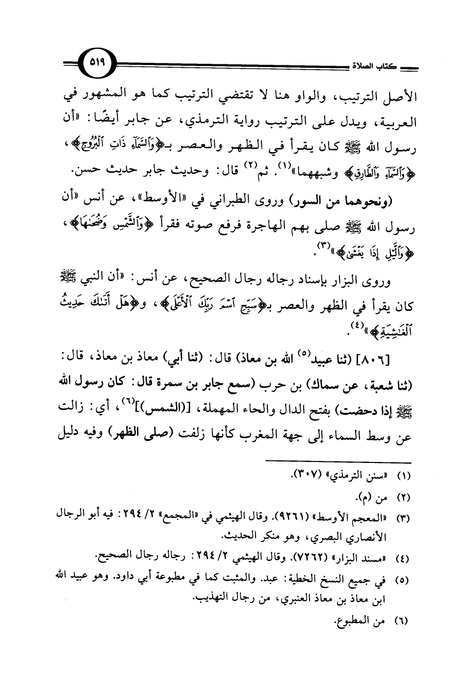 الأصل الترتيب، والواو هنا لا تقتضي الترتيب كما هو المشهور في العربية، ويدل على الترتيب رواية الترمذي، عن جابر أيضًا: "أن رسول الله - صلى الله عليه وسلم - كان يقرأ في الظهر والعصر بـ {وَالسَّمَاءِ ذَاتِ الْبُرُوجِ}، {وَالسَّمَاءِ وَالطَّارِقِ} وشبههما" (¬1). ثم (¬2) قال: وحديث جابر حديث حسن.