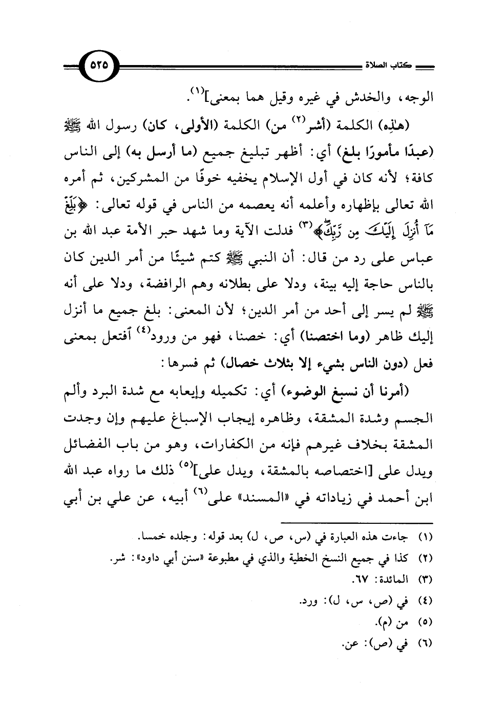(هذِه) الكلمة (أشر (¬2) من) الكلمة (الأولى، كان) رسول الله - صلى الله عليه وسلم - (عبدًا مأمورًا بلغ) أي: أظهر تبليغ جميع (ما أرسل به) إلى الناس كافة؛ لأنه كان في أول الإسلام يخفيه خوفًا من المشركين، ثم أمره الله تعالى بإظهاره وأعلمه أنه يعصمه من الناس في قوله تعالى: {بَلِّغْ مَا أُنْزِلَ إِلَيْكَ مِنْ رَبِّكَ} (¬3) فدلت الآية وما شهد حبر الأمة عبد الله بن عباس على رد من قال: أن النبي - صلى الله عليه وسلم - كتم شيئًا من أمر الدين كان بالناس حاجة إليه بينة، ودلا على بطلانه وهم الرافضة، ودلا على أنه - صلى الله عليه وسلم - لم يسر إلى أحد من أمر الدين؛ لأن المعنى: بلغ جميع ما أنزل إليك ظاهر (وما اختصنا) أي: خصنا، فهو من ورود (¬4) افتعل بمعنى فعل (دون الناس بشيء إلا بثلاث خصال) ثم فسرها: