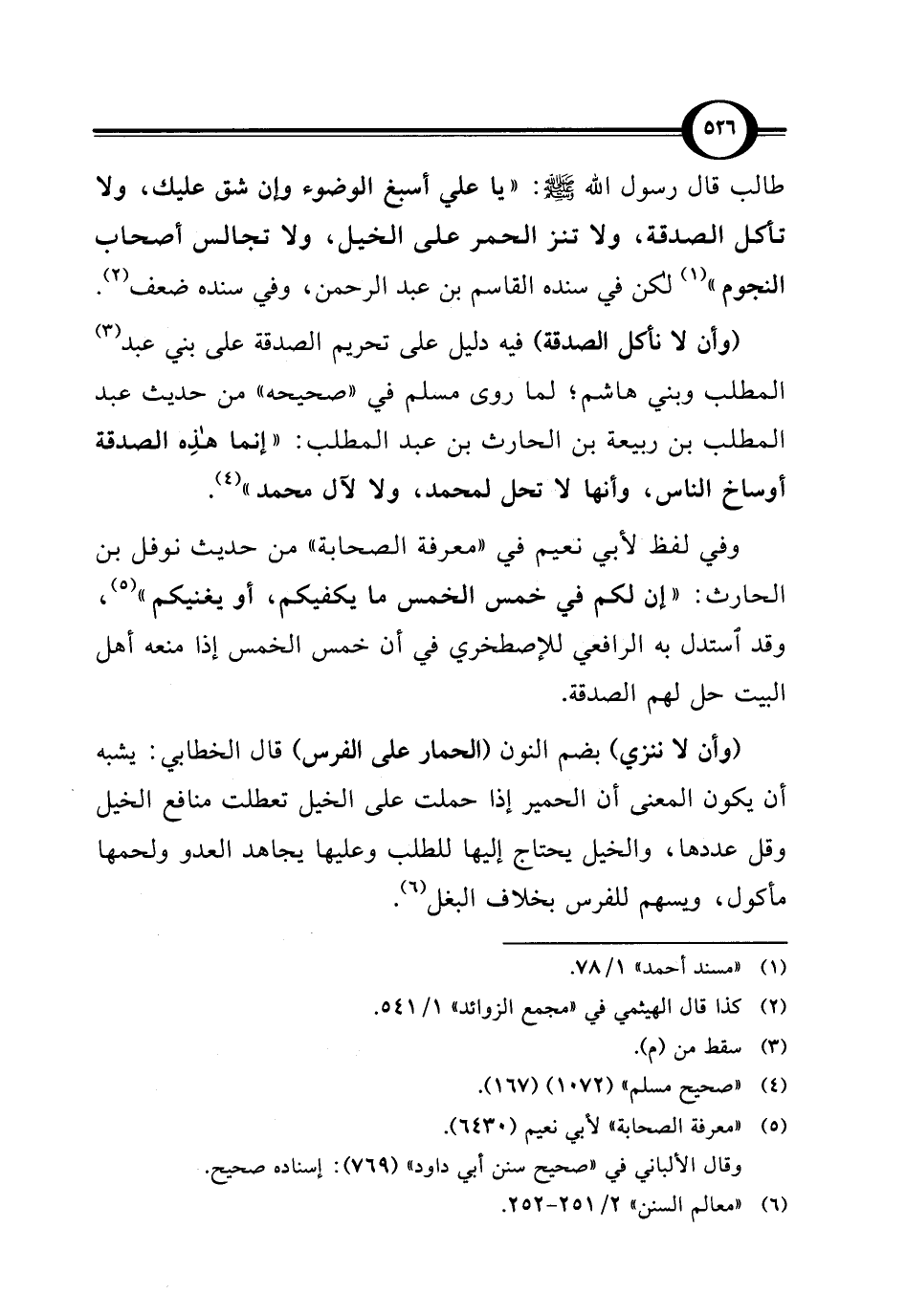 طالب قال رسول الله - صلى الله عليه وسلم -: "يا علي أسبغ الوضوء وإن شق عليك، ولا تأكل الصدقة، ولا تنز الحمر على الخيل، ولا تجالس أصحاب النجوم" (¬1) لكن في سنده القاسم بن عبد الرحمن، وفي سنده ضعف (¬2).