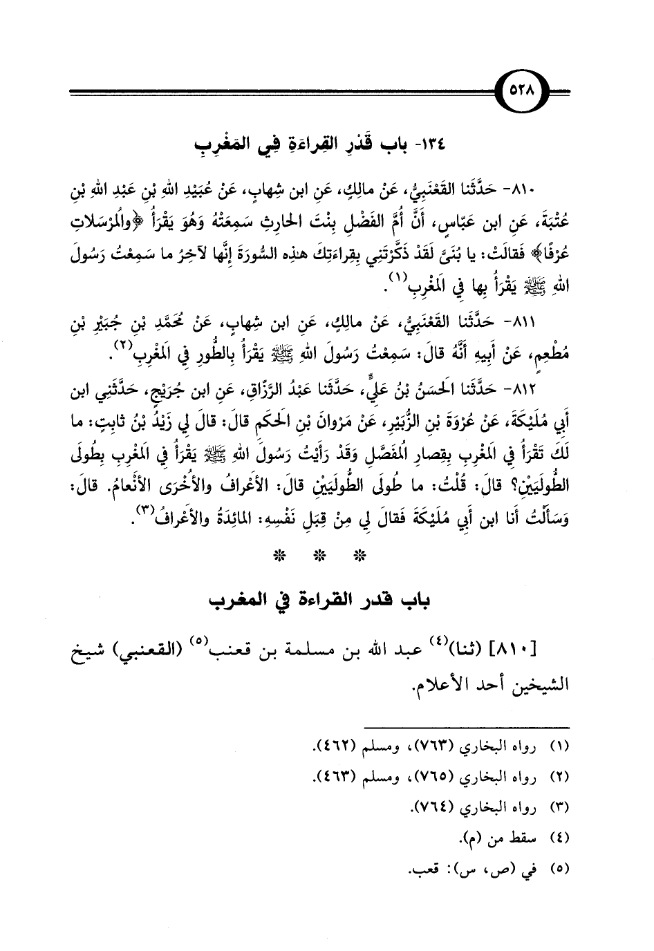 811 - حَدَّثَنا القَعْنَبِيُّ، عَنْ مالِكٍ، عَنِ ابن شِهابٍ، عَنْ محَمَّدِ بْنِ جُبَيْرِ بْنِ مُطْعِمٍ، عَنْ أَبِيهِ أَنَّهُ قال: سَمِعْتُ رَسُولَ اللهِ - صلى الله عليه وسلم - يقْرَأُ بِالطُّورِ فِي المَغْرِبِ (¬2).