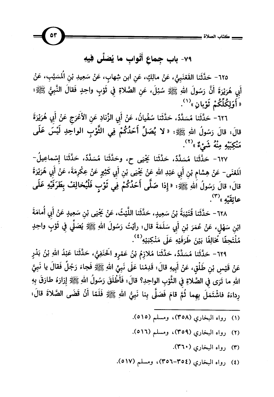 626 - حَدَّثَنا مُسَدَّدٌ، حَدَّثَنا سُفْيانُ، عَنْ أَبِي الزِّنادِ عَنِ الأَعْرَجِ عَنْ أَبِي هُرَيْرَةَ قال: قال رَسُولُ اللهِ - صلى الله عليه وسلم -: "لا يُصَلِّ أَحَدُكُمْ فِي الثَّوْبِ الواحِدِ لَيْسَ عَلَى مَنْكِبَيْهِ مِنْهُ شَيءٌ" (¬2).